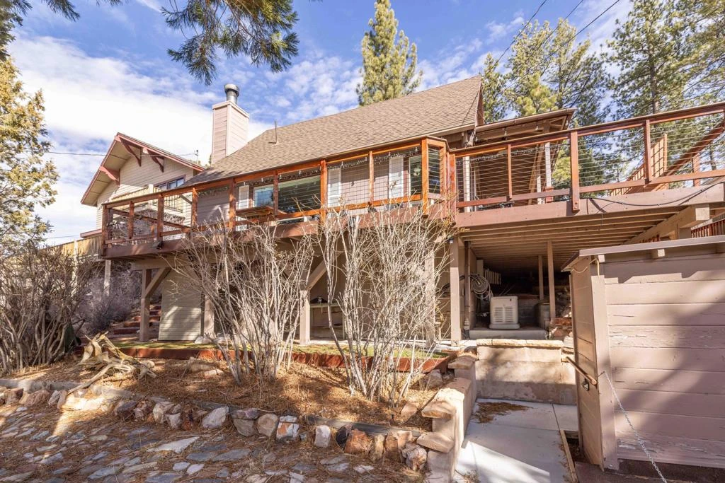 This meticulously maintained Moonridge property is a must-see, with great views of Bear Mountain & the golf course! Across the street from 5th hole & set back off street for privacy, and plenty of parking. The yard boasts multiple levels of decking to enjoy the views & weather, plus a horseshoe pit & plenty of room for guests. Inside, knotty pine T&G walls, ceilings, accents, & native rock fireplace w/efficient wood-burning insert to keep you warm and cozy on those chilly evenings. Upgrades like slab counter w/gas cooktop in the kitchen, stone counters in baths, mosaic tile in downstairs shower, MoenFlo water flow control system, whole house generator, solar powered outdoor lights, & low maintenance Trex decking make this cabin extra special. This home shows pride of ownership. This cabin comes fully furnished and has a lot of storage, including 2 finished rooms in the buildup, mudroom cabinets & covered firewood area. Just a short distance to Bear Mountain Ski Area, the Big Bear Alpine Zoo, and the new Moonridge Corridor. Centrally located, just minutes to the lake, Village, and all that this beautiful valley has to offer.