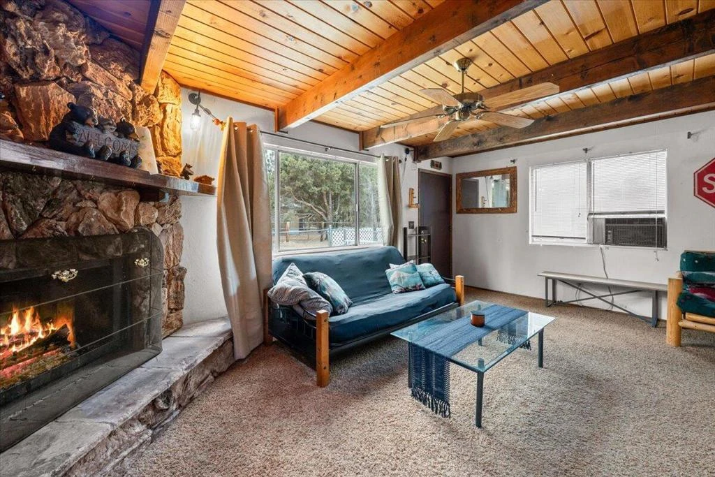 Classic gambrel-style cabin in a peaceful Erwin Lake neighborhood. Features include beamed ceilings, a wood-burning rock fireplace, an eat-in kitchen, and two spacious bedrooms with one bath. The level, fenced lot with concrete parking offers easy access and year-round convenience. A solid investment opportunity in Big Bear.