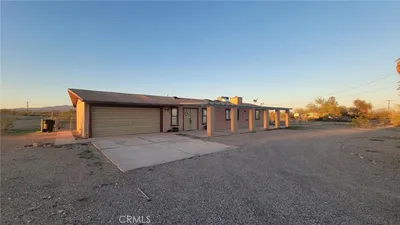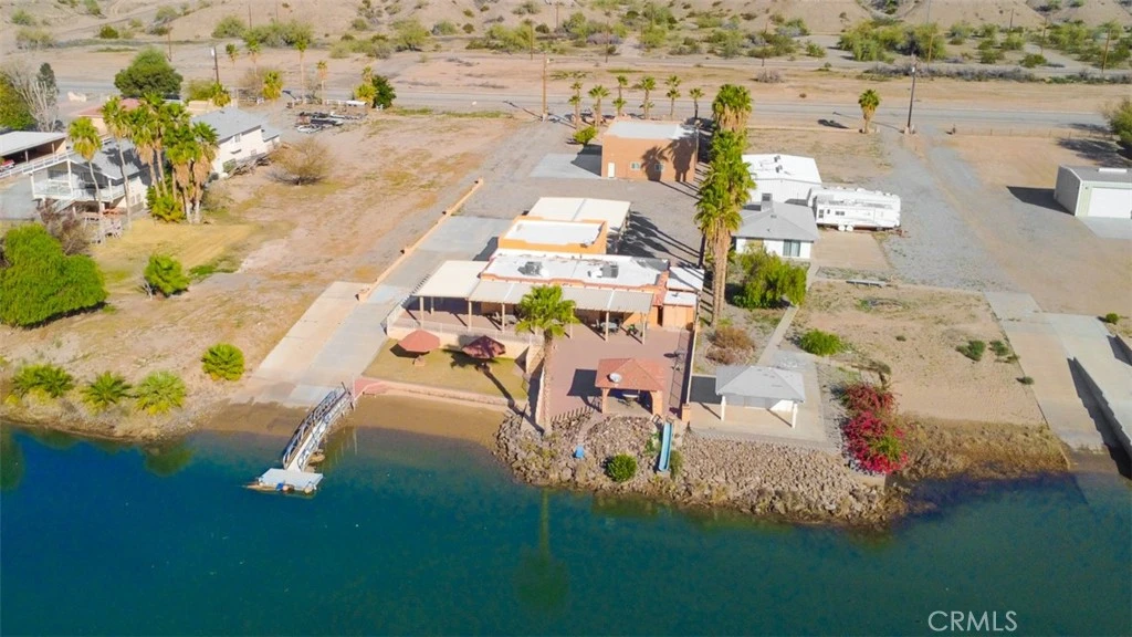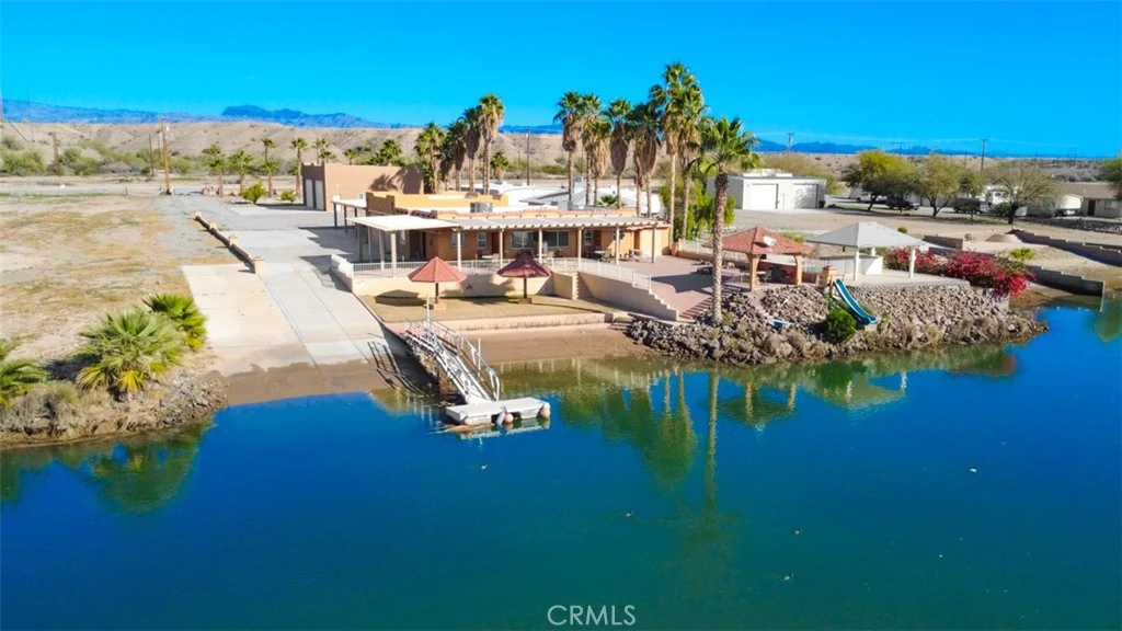 MAJESTIC – One-of-a-Kind Riverfront Property! Located just six miles west of Parker on the California side of the Colorado River, this Spanish-style custom home was designed to embrace and share the ultimate river lifestyle. Thoughtfully set up like a duplex, one side offers 2 bedrooms, a bathroom, living/dining area, full kitchen, covered side patio, and storage shed. The other side features an oversized bunk-style bedroom designed to accommodate multiple beds, plus its own bathroom, living/dining area, and kitchen—perfect for hosting family and friends. The property also includes a massive stucco garage, plenty of room for 8 cars, boats and all your toys, complete with an additional room and bathroom inside, 5th-wheel hookups with patio, and approximately one acre enclosed by brick-lined walls accented with Sedona desert rock, palm trees, and fruit trees, with ample room to build, expand, or plant more. The riverfront is truly exceptional—stylish paved brick shoreline, stone fire pit, gazebo at the water’s edge, built-in bar and table, water slide, diving board, private beach area with retaining wall and sand, two palapas with tiled tables, outdoor shower, private boat ramp, dock, and designated swim area when water levels allow. Ideal as a retirement retreat, vacation getaway, or multi-family river compound.