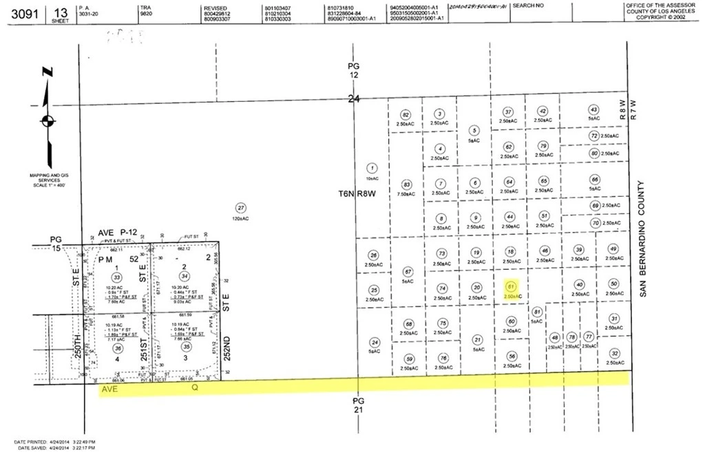 APN 3091-013-061Lot Area 110,961SQFT latitude 34,58966 Longitude -117.67088. Buyer(s) is responsible for conducting all necessary investigations to their satisfaction including verifying zoning, soil conditions, permitted uses, legal access, parcel size, buildable space, services with the appropriate city or County. Buyer is also advised to consult with the department of fish and wildlife regarding any protected plants, trees, or species. Property lines depicted in photos are estimated. Buyer to verify.
