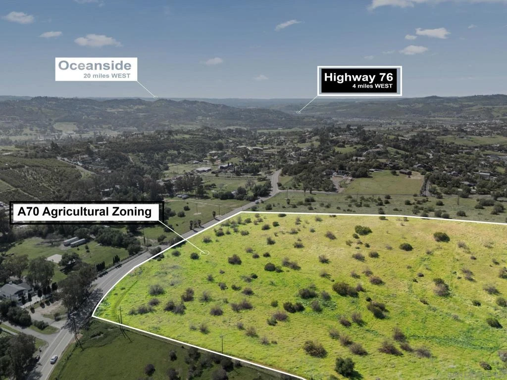 Rare 20-acre agricultural opportunity on Lilac Road in Bonsall. Zoned A70 and located in the unincorporated area of San Diego County, this parcel offers paved main road frontage, electricity on site, and a high-capacity agricultural water system already in place. Previously leased for commercial strawberry production by Marie Callender's, the property has a history of productive farming use. Approximately 1 mile from Bonsall High School and about 6-7 miles to the Interstate 15 corridor, the location provides a blend of rural privacy with convenient access to major transportation routes. Zoned A70 with potential for agricultural use and residential development subject to county approval. Buyer to verify zoning, lot split potential, utilities, and all development possibilities with San Diego County. A unique opportunity for growers, investors, estate home builders, or land bankers seeking North County acreage with infrastructure in place. provides a blend of rural privacy with convenient access to major transportation routes. Zoned A70 with potential for agricultural use and residential development subject to county approval. Buyer to verify zoning, lot split potential, utilities, and all development possibilities with San Diego County. A unique opportunity for growers, investors, estate home builders, or land bankers seeking North County acreage with infrastructure in place.