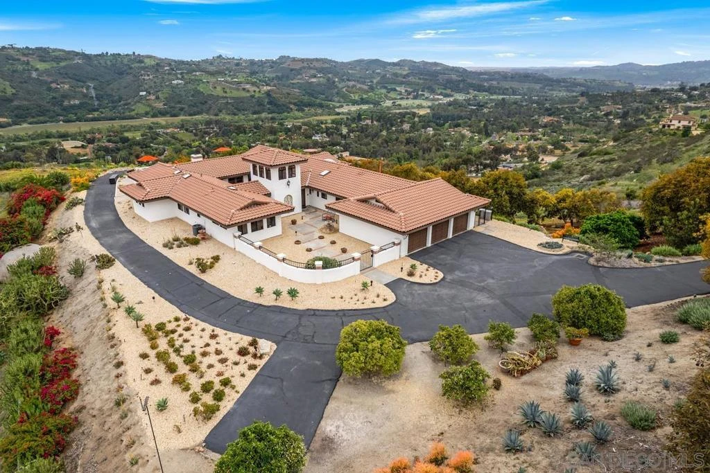 Perched high on a scenic hilltop, this exceptional residence commands breathtaking panoramic views of rolling hills and lush landscapes. Nestled within the exclusive, gated community of Saratoga Estates, the home offers a charming blend of luxury, privacy, and tranquility. Upon entering you'll experience a spacious open-air courtyard featuring a fountain w/rustic Spanish tiles, where French doors encircle the entry and Great Room, creating a seamless flow between indoor and outdoor living. Vaulted ceilings with rich wood finishes and a cozy fireplace enhance the Great Room’s serene ambiance. Expansive windows flood the space with natural light and showcase endless, uninterrupted vistas. Whether savoring a quiet morning on the terrace in the Solar heated, saltwater pool and spa or hosting lively gatherings, this stunning home provides an idyllic, picturesque setting for every moment. This single-story custom home invites you to experience sweeping hilltop views and timeless Spanish charm overlooking the exclusive Saratoga Estates. Inside, warm Saltillo tile and a serene open-air courtyard with a bubbling fountain set a welcoming tone, creating a seamless connection between indoor and outdoor living. The Great Room is a showstopper, with vaulted, wood-beamed ceilings accented by iron turnbuckles, rich built-in cabinetry, and a full wet bar—all opening to the courtyard or sparkling saltwater pool in back. Each of the three spacious bedrooms features its own en-suite bath, while two additional half-baths provide convenience for guests. The inviting primary suite includes a cozy fireplace, jetted tub, and separate shower for a true retreat feel. The chef’s kitchen is both functional and stylish, with stainless steel appliances, sleek black granite counters, a walk-in pantry, and a formal dining room nearby—ideal for gatherings. A wrought iron spiral staircase leads to the Mirador tower, where unobstructed views stretch for miles. Step outside to enjoy a solar-heated saltwater pool and spa with a cascading waterfall, plus a built-in BBQ area with sink and refrigerator—perfect for entertaining. Set on over 10 acres offering a family avocado grove and assorted citrus trees with potential space for ADU. The property also includes a separate laundry room, 3-stall garage, w/workshop and additional space for RV Parking. This is Southern California living at its finest—private, peaceful, and designed to savor every sunset.