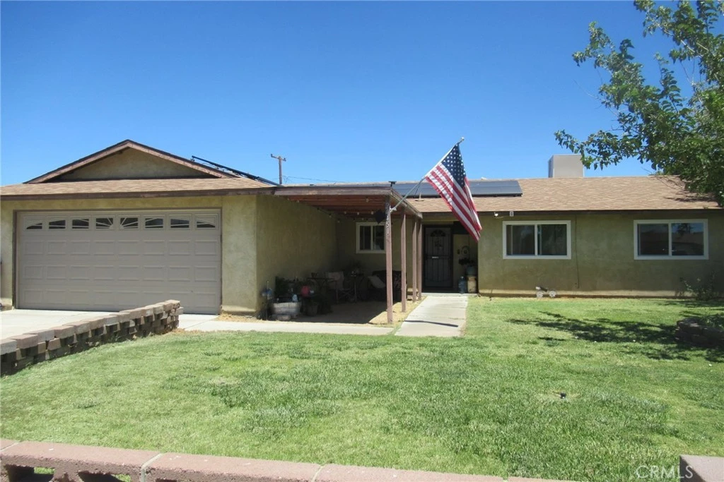 Discover this thoughtfully designed three-bedroom, two-bathroom home spanning 1,194 square feet in the welcoming community of Boron. This property showcases modern updates throughout, including elegant laminate flooring and energy-efficient dual pane windows that flood the interior with natural light. The heart of the home features an open-concept kitchen and dining area, complete with a convenient eat-in bar for casual dining and entertaining. A mini split system in the living room ensures year-round comfort, complemented by central heating and newer primary cool ducting. Ceiling fans throughout provide additional climate control and ambiance. The generously sized primary bedroom offers a peaceful retreat, while two additional large bedrooms provide flexibility for family, guests, or home office space. Outside, the property truly shines with its exceptional outdoor amenities and impressive lot size. The backyard is an entertainer's paradise, featuring two covered patios perfect for year-round outdoor dining and relaxation. Mature trees and lush grass create a park-like atmosphere, all enclosed by a block wall ensuring complete privacy. Recreation vehicle enthusiasts will appreciate the full hookups and large covered steel metal port, plus an additional second sewer hookup with convenient access. Practical features include two large windowed storage sheds and an impressive nineteen solar panels for energy independence. The front and backyard landscaping includes established grass, shrubs, and mature trees, creating beautiful curb appeal. Located within close proximity to Boron Junior-Senior High School and local amenities, this property offers the perfect blend of modern convenience and small-town charm, making it ideal for those seeking comfortable living with ample parking and outdoor recreation opportunities.