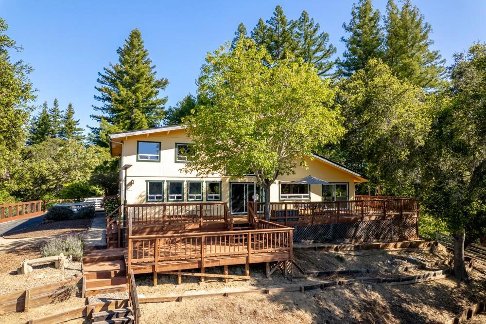 Gorgeous mountain estate with breathtaking views and modern comforts. Nestled on over 8 private acres just northeast of Boulder Creek, this stunning mountain estate offers the perfect balance of peaceful seclusion and commuter convenience. Soaring cathedral ceilings, exposed beams, & a striking cobblestone fireplace define the spacious great room & inviting space that opens to expansive decks ideal for entertaining or simply soaking in the panoramic mountain views. The updated kitchen is a chefs dream, featuring quartz countertops, a stylish glass backsplash, a center island with gas range, and heated floors that extend throughout the lower level. Upstairs, the primary suite is a true retreat with sweeping views, a large en suite bathroom, a huge walk-in closet, and a bonus room perfect for an office, studio, or crafting space. A 700 sq ft studio with loft above the garage provides versatile space for guests, income potential, or multigenerational living. The oversized two-car garage includes workbenches & ample storage, & the property is wired for a generator, with a portable 8,000-watt generator included. The large acreage allows for the possibility of horses. This rare gem combines modern upgrades, privacy, and natural beauty, all just minutes from the heart of Boulder Creek.