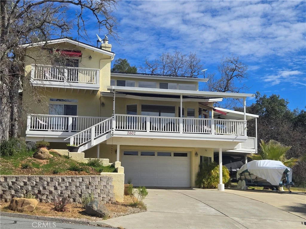 Experience the ultimate Lake Nacimiento lifestyle in this stunning 4-bedroom, 4-bathroom, 3,200 sq. ft. retreat. Nestled within the gated community of Oak Shores, this three-level home offers breathtaking lake views and a seamless blend of luxury and natural beauty. Step inside to discover a spacious Great Room with a vaulted ceiling, anchored by a cozy wood burning stove. An adjacent Library/Office/Game room and Dining area provide ample space for entertaining. Large windows flood the space with natural light, framing panoramic lake views from most rooms. Enjoy modern conveniences like surround sound and Wi-Fi-controlled window shades. The gourmet Chef’s Kitchen boasts granite tiled countertops, a center island, counter bar seating, an adjacent walk-in pantry, and stainless steel appliances, including double-bowl and triple-bowl sinks. A main-level bedroom with sliding doors opens to the backyard deck, complemented by an elegant travertine bathroom. The laundry room offers abundant storage, granite tiled counters, a sink and plumbing for a second refrigerator. Upstairs, two luxurious bedroom suites showcase breathtaking lake views and private decks. The primary suite features a grand double door entry, cathedral ceiling, a walk-in closet, and a spa-like Bath with travertine stone tile, dual sinks, a dual-head walk-in shower, plus soaking tub. A second ensuite has 2 closets and a full bath. The 1st floor provides a versatile bedroom with a private sliding door exit patio, & beautiful travertine Bath, for guests or family. Entertain or relax on the expansive wrap-around covered deck perfectly designed to maximize your enjoyment of the stunning views. The property includes an oversized 1000sf 4 car tandem garage, plus a 170sf workshop/storage area, perfect for vehicles, water toys and hobbies, plus has a mini-split heat & cool unit. Ample parking is provided by a paved driveway & carport, for RV’s and watercraft. This home is equipped with energy saving conveniences, including 30 owned Tesla solar panels with a 40kWh Powerwall battery system, a Google Nest integrated thermostat & smoke/carbon dioxide detectors, and Wi-Fi controlled B-Hyve irrigation. Oak Shores, known for the natural beauty of the lake, it's abundant wildlife, breathtaking night skies, & amenities-- marina, 2 launch ramps, boat slips, clubhouse, pool, campground, pickleball, basketball, mini golf and hiking trails. private guard gate, plus many activities.