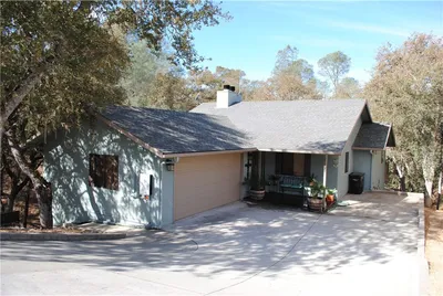 Nestled in the private community of Oak Shores, this charming 2-bedroom, 2-bathroom home offers cozy cabin vibes with modern comfort. Step into the inviting living room, featuring vaulted ceilings, a wood-burning stove, and an open view of the versatile upstairs loft—perfect as an extra living space or home office. Warm knotty pine paneling adds rustic charm throughout. Both bedrooms boast vaulted ceilings, creating a spacious and airy feel, while the primary suite offers peaceful views of mature oak trees and sliding glass doors that lead directly to the backyard. The centrally located kitchen flows easily into the dining area, which opens to a shaded outdoor patio—ideal for relaxing or entertaining under the oaks. With a flat driveway and an attached garage approximately 22 feet deep, there’s plenty of room to store your lake toys. Whether you're looking for a full-time residence or a weekend getaway, this Oak Shores gem is ready to welcome you home.