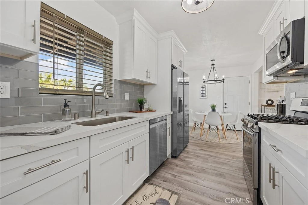 Offered for sale is this beautifully renovated 3 beds 1.5 bath home with an attached 1 bed, 1 bath Accessory Dwelling Unit (ADU) that was built in 2016 and measures approximately 499 sq ft. The ADU has entrances directly from the main home and separate exterior entrance that can be used as either part of the living area of the main home or a totally separate unit. As you walk through the main home, you'll notice the new laminate flooring, fresh paint, and updated lighting fixtures throughout. The kitchen has been remodeled with new cabinets, quartz countertops, glass backsplash tiles and new appliances. Additional upgrades include updated bathrooms, new ceiling fans, new 200 amp solar ready electrical panel, tankless water heater, 5 year old roof, and 5 year old HVAC system. The ADU features a spacious bedroom with attached full bathroom, full kitchen with bar counter and pendant lighting, cozy living room and a separate fenced yard. You will not find a more perfect setup for this ADU with so much flexibility in its use, including as a rental unit if desired. We welcome you to stop by and take a look for yourself.