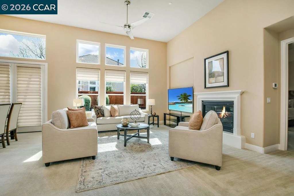 Welcome to Trilogy at the Vineyards, the East Bay's premier gated 55+ resort community. This pristine Ravello model in Bordeaux Village sits on a corner homesite and features a rare builder option: dramatic 13-foot ceilings with clerestory windows that flood the great room with natural light — a premium upgrade found in only a handful of homes in the village. The open great room flows to a chef's kitchen with granite counters, Jenn-Air stainless appliances, gas cooktop, wall oven, and large island. Eight-foot interior doors throughout add to the grand, airy feel. The primary suite offers French doors to the patio, dual vanities, stall shower, and walk-in closet. Flexible den, spacious guest bed and bath. The backyard is a true retreat: expansive pergola-covered paver patio with lush landscaping. Pre-paid 20-yr solar lease, tankless water heater, water softener, 2-car garage. Club Los Meganos amenities include pools, spa, pickleball, tennis, fitness, restaurant, wine events, and more. Resort living at its finest.