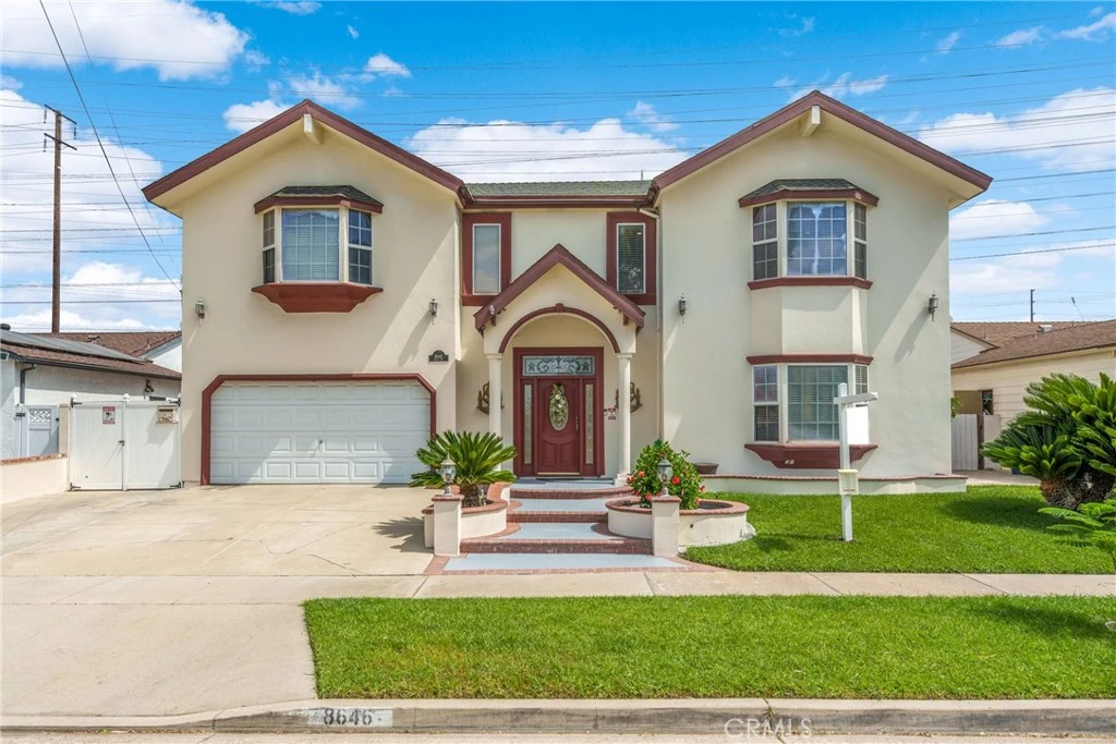 Stunning Award-Winning 5 Bedroom Home with Luxury Features. Welcome to an extraordinary home that has earned recognition from the City of Buena Park for its exceptional design and quality. This spacious, 2-story residence is among the largest homes in the neighborhood, offering 5 bedrooms, 4 full bathrooms, 2,992 sq. ft. of living space. Enter into a grand, light-filled foyer with high ceilings and travertine floors. The open living room invites you in with a beautiful bay window and connects to the formal dining area and a large family room with a counter-height bar for sipping coffee or having a snack after school. The family room features large built-in cabinets, laminate flooring and room for plenty of seating to relax with family & friends. The French doors to the backyard let in plenty of natural light. The private yard is designed to entertain, with a covered patio, outdoor fire pit, and a built-in bbq area, complete with a sink. It also has abundant mature fruit trees, including orange, mandarin, pomegranate, lime, and peach, so you can enjoy fruit all year long. In the evenings, sit outside and view & hear the fireworks from Disneyland! Adjacent to the dining room, you’ll find a gourmet kitchen featuring ample counter space and room for a cozy breakfast nook. It provides convenient access to the two-car garage, which has a full-size washer & dryer and boasts plenty of storage. The rest of the first floor offers 2 large bedrooms with laminate flooring, two full bathrooms (one ensuite bathroom), and several thoughtfully placed closets for your linens and jackets. A third room on this floor can be used as a home office or playroom. Up the oak staircase, you’ll find two very expansive primary suites, each with a walk-in closet and full bathrooms. The first is a massive 23’x18’ retreat featuring a bay window, cathedral ceiling, and enough space for a sitting or living area. The bathroom includes a dual vanity, a luxurious walk-in shower, and the ability to soak in your jacuzzi jet bath . The second primary suite is 23’x15’, also with a cathedral ceiling, a bay window, a ceiling fan, and a jacuzzi jet bath. With modern amenities like a Tesla charger/220-volt electrical access in the garage, a new HVAC system, in-house owned 8-wired security camera system and an on-demand hot-water heater, this home is designed for both luxury and convenience. Less than half a mile to Buena Park Mall, 1 mile to Knott’s Berry Farm & Portos, and 10 minutes from Disneyland.