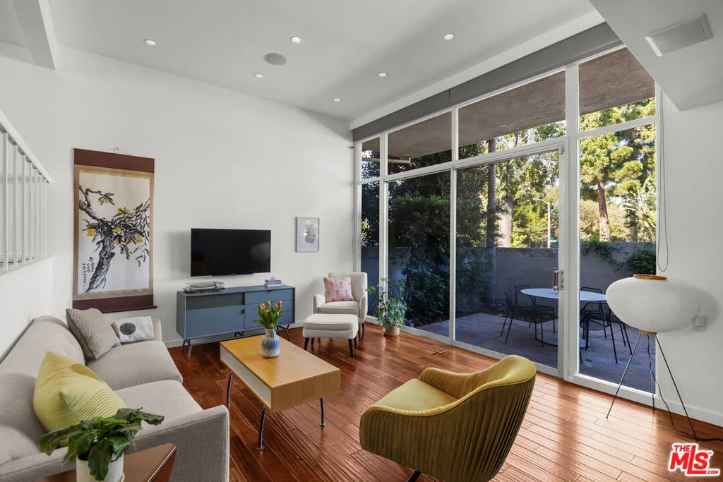 Stylish 3-Bedroom Mid-Century Townhouse in Prime Toluca Lake / Burbank Location. This 1960s mid-century townhouse perfectly combines timeless architecture with modern sophistication. Featuring 3 bedrooms and 2.5 bathrooms, including a convenient powder room on the main level, this home offers both style and functionality. Step inside to find soaring ceilings, teak laminate floors, and a terraced open kitchen and dining area designed for effortless entertaining. The remodeled kitchen showcases sleek cabinetry, Bosch dishwasher, stone tile, and premium fixtures, complemented by Lutron-controlled recessed lighting and distributed audio throughout. Floor-to-ceiling windows bathe the living room in natural light, opening to a private patio ideal for relaxing or dining al fresco. Upstairs, the elegant primary suite features a spacious balcony with a view, motorized shades, custom closet, and a modern bath with HansGrohe fixtures. Two additional spacious bedrooms and beautifully remodeled bathrooms featuring designer tile and mirrors round out the top floor. Enjoy peace of mind and comfort with dual-glazed windows, a fully upgraded HVAC system, tankless water heater, Nest thermostat, and newly re-piped ABS sewer lines (2025). Additional amenities include an attached two-car garage with EV charging outlet, ample storage space, in-unit laundry, and access to a sparkling community pool in the courtyard of this well-maintained townhouse complex. Located just minutes from Warner Bros., Universal Studios, Disney, the Los Angeles Equestrian Center, Whole Foods, and the lively shops, cafes, and restaurants of charming Toluca Lake Village and Magnolia Park, this home offers the perfect blend of design, comfort, and convenience in one of the Valley's most desirable neighborhoods. A rare opportunity to own a true mid-century gem, thoughtfully updated for today's modern lifestyle.