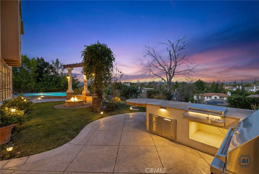 Located in the prestigious guard-gated community of The Oaks of Calabasas, this stunning 5-bedroom, 6-bathroom estate offers luxury living with breathtaking mountain and city-light views. Light-filled interiors feature floor-to-ceiling glass doors that open to seamless indoor-outdoor living. The versatile floor plan includes a main-level guest suite with private entrance and en-suite bath, ideal for guests, in-laws, or a private office. A separate casita currently used as a gym adds flexibility for a fitness studio, office, or creative space. Upstairs offers four spacious en-suite bedrooms plus a large family/media lounge. The primary suite retreat features a sitting area, fireplace, and sweeping views. Residents enjoy resort-style amenities including 24/7 guard-gated security, a private clubhouse, state-of-the-art fitness center, Olympic-size pool, tennis and pickleball courts, and miles of scenic hiking and walking trails.