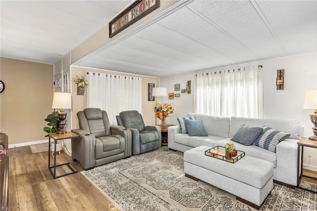 Beautiful Sharondale Home on the Greenbelt. Located in a 55+ senior community in Calimesa. Triple wide manufactured home with 3 bedrooms and 2 bath, plus an office. Great split floorplan with 2 bedrooms and bath in front and Primary Ensuite at the other end with Exquisitely upgraded Bath with soaking tub, dual sinks and Seperate Shower. Spacious Greatroom with TV area, Pool Table and Dining area. Kitchen with updates, spacious counter tops, coffee bar, side island with eating bar. Dual Pane Windows. Upgrades 2021 heating and air conditioner and 2024 a 50 year roof. Large Covered Front Porch, Carport, Large Storage or workshop you decide and fenced backyardn with special artificial Turf, vinyl fencing and wrought Iron fencing on the green belt. Special connection for a generator to run. Sharondale offers clubhouse, swimming pool and activites. Locate close to the I-10 Singleton exit that goes to Upper Yucaipa via Bryant to Hwy 38 and on ramp to Beaumont via Singleton on ramp. Manufactured home 433.