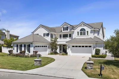 Tucked away in Camarillo's coveted Spanish Hills community and perched on the 15th fairway of the Spanish Hills Club, 1069 Corte Barroso sits on one of the best lots in the neighborhood. This grand 7,121 SF contemporary estate on a flat, lush 1-acre lot features 6 bedrooms, 6.5 bathrooms, and a fully gated entrance offering premier privacy and exclusivity. Panoramic golf course and ocean views elevate everyday living in this beautifully designed residence that blends rich textures, clean lines, and luxurious scale. A dramatic formal entry welcomes you into voluminous interiors, where a soaring great room with a stone fireplace and oversized windows creates an elegant yet inviting space for gathering. The fully renovated and expanded kitchen is a chef's dream, outfitted with paneled Sub-Zero and Asko appliances, Wolf double ovens, induction + gas cooktop, microwave, two warming drawers, a large island with breakfast bar, dining area, built-in desk, and separate scullery. Oversized windows and a wall of French doors frame the serene outdoor space, enhancing the seamless indoor-outdoor flow. Flanking the entry are formal living and dining rooms, while the true showpiece downstairs is a moody, speakeasy-style bar with mini fridges, ice machine, oversized wine fridge, and custom woodwork. The main level also includes a spacious primary suite, laundry room, and an additional bedroom converted into a stunning office with custom cabinetry. Upstairs, a second expansive primary suite offers a large sleeping area, sitting room, modern electric fireplace, and French doors that open to a private terrace with jaw-dropping 180-degree views of Camarillo, the golf course, airport, and the Channel Islands--where sunsets are a daily highlight. Three additional guest bedrooms upstairs each feature ensuite baths for optimal comfort. The entertainer's backyard features lush, meticulously landscaped grounds, a renovated pool and spa, covered patio with built-in speakers, TV lounge with fireplace, full outdoor kitchen, putting green, and separate fire pit area. With an oversized 3-car garage, Tesla wall, owned solar and water purification systems, RV parking, and a truly unbeatable location, this estate is a rare offering and an exceptional place to call home.