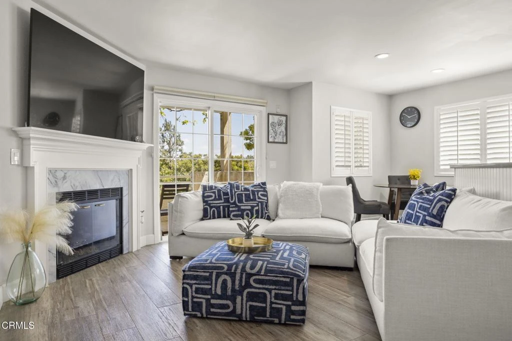 Easy-Access, Remodeled End Unit with Mountain Views in Camarillo!Convenience meets comfort in this beautifully remodeled lower-level end unit, perfectly situated in a 3 story building and only steps from your covered parking to your front door. Enjoy the benefits of a prime location with minimal effort and maximum accessibility.This light-filled 1 bedroom, 1 bath condo offers a thoughtfully designed living space with serene mountain and tree views. Inside, you'll find stylish wood plank tile flooring, smooth ceilings with recessed lighting, and newer dual-pane Pella windows accented with plantation shutters.The light and bright living room is adorned by a tasteful marble fireplace, creating a cozy yet elegant focal point. Just off the living area and breakfast nook, a quaint private balcony invites you to relax and enjoy the fresh air, perfect for morning coffee or winding down at sunset.The bright white kitchen is a showstopper, featuring soft-close cabinets and drawers, a functional kitchen island with generous storage, a neutral quartz countertop, and both a pantry and linen closet for optimal organization.The spacious primary bedroom is a relaxing retreat with a custom closet to keep everything tidy. The updated bathroom features a quartz vanity and charming wainscoting, giving the space a fresh, finished look.Just steps from the front door, you'll find a convenient private laundry room and two assigned covered parking spots, making day-to-day living simple and stress-free.Located in the desirable Vista Camarillo community, you'll enjoy resort-style amenities including a pool, spa, tennis and basketball courts, clubhouse, and a playground. HOA covers water, trash and insurance for added peace of mind.This home is ideally located near the Camarillo Premium Outlets, Camarillo Grove Park, and convenient freeway access for commuting. It's also just a short drive to California State University Channel Islands and Ventura College, making it a great option for those connected to higher education or simply seeking an active connected lifestyle.Don't miss this turn-key opportunity to live in a beautifully updated, easily accessibile condo in one of Camarillo's most scenic settings!!
