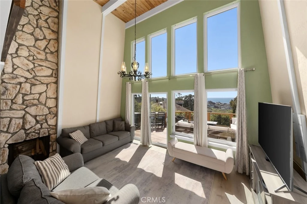 Enjoy some of the most captivating panoramic ocean views in Cambria from this beautifully remodeled 3-bedroom, 2-bath home set on a street-to-street 13,433 sq ft lot on sought-after Happy Hill. Just moments from the West Village and Moonstone Beach, the home offers an effortless beach-home feeling paired with thoughtful modern upgrades. The newly remodeled kitchen features crisp quartz countertops and updated finishes, perfectly complementing the refreshed bathrooms. A bedroom and full bath on the main living level add convenience and flexibility. The dramatic living room—with nearly 18-foot ceilings, a cozy fireplace, and expansive windows—opens to a large view deck that truly extends the living space. It’s an ideal setting for morning coffee, outdoor dining, or simply taking in the whitewater views of Moonstone Beach and the Santa Rosa Creek estuary. A versatile bonus room below provides additional space for guests, hobbies, or work, and a detached storage shed offers extra room for tools, gear, or creative uses. The street-to-street configuration enhances privacy and helps protect the incredible views that make this home so special. A rare blend of coastal charm, modern comfort, and sweeping ocean vistas—this home captures the very essence of Cambria.