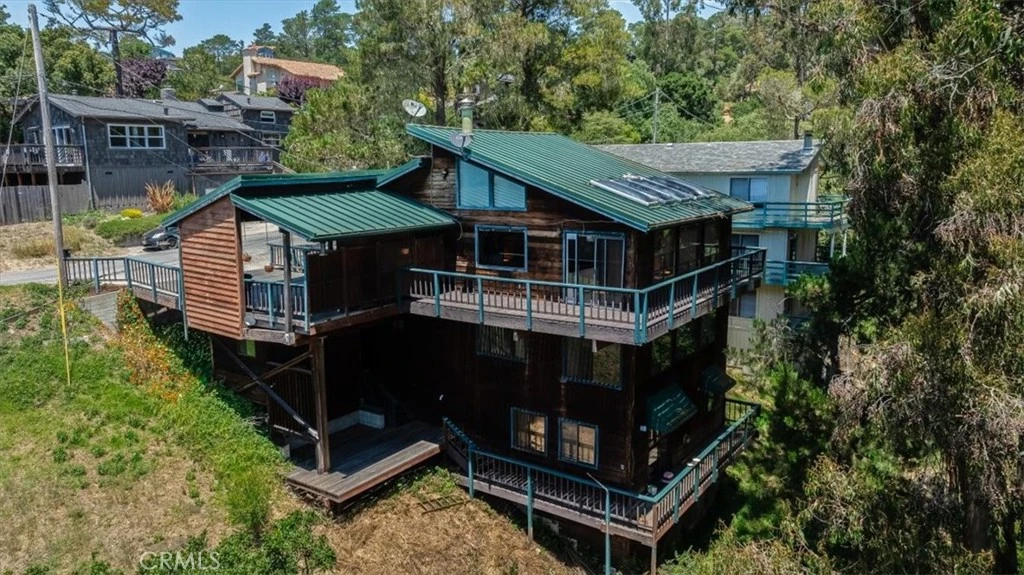 HUGE PRICE IMPROVEMENT! Nestled in classic Cambria style, this Big Sur inspired home awaits your vision. With FIVE bedrooms spread across its spacious layout, including a charming studio apartment for potential income, this property offers endless possibilities. Just bring your love and imagination. The main level features a well-appointed kitchen, an expansive living/dining area warmed by a free-standing wood burning stove, and an inviting sun porch adorned with five skylights and expansive windows that flood the space with natural light and breathtaking views. Enjoy sparkling ocean vistas from both the living room and primary bedroom, complemented by wrap-around decks that extend your living space outdoors. Additional highlights include storage in the covered carport, a bonus workshop for your creative endeavors, and convenient laundry facilities on the main floor. Downstairs, discover a half bath and full bath off the hallway, ensuring comfort and convenience for all. Surrounded by lush forest and open space that provides privacy and serene views, this home beckons transformation into a true showpiece. If you're seeking a project that promises to fulfill your vision of coastal living, this is your opportunity to bring this gem back to life. Come explore and let your imagination take flight!