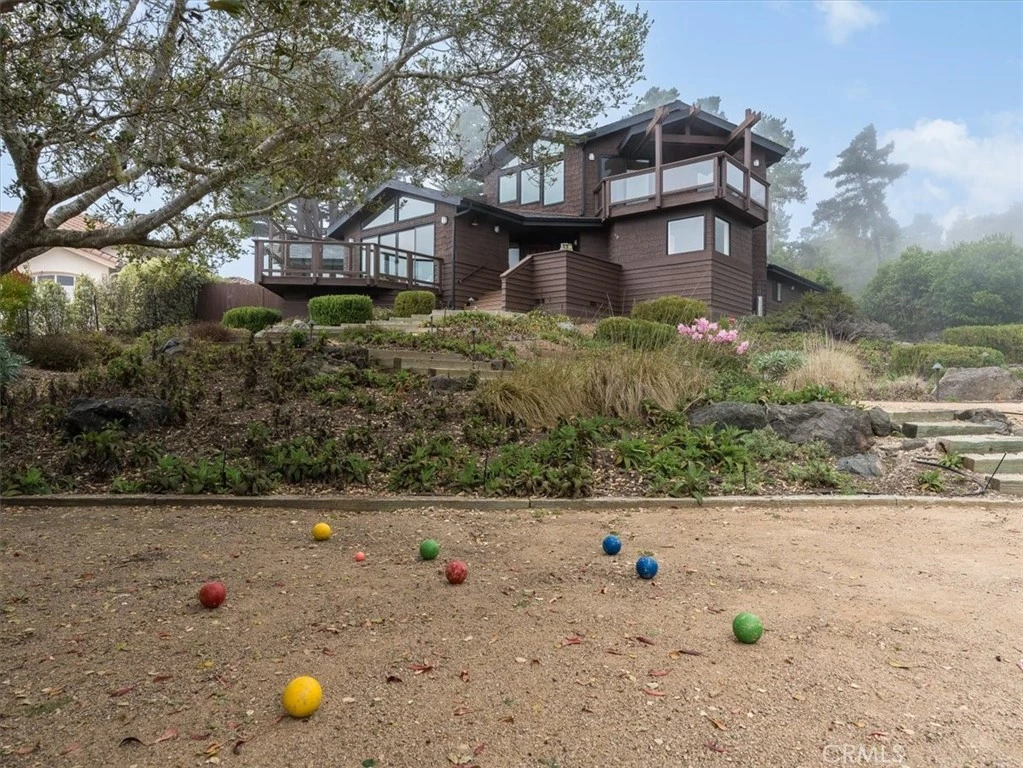 This new listing has two of the most desired features of any Cambria home; beautiful ocean views, and a gate directly into the Fiscalini Ranch open space preserve. Yep, right outside your backdoor is Cambria’s most treasured gem with over 400 acres of walking and biking trails, and dotted with artistic benches for viewing pleasure! This generously sized Cambria Pines Estates home home sits high upon the 100’x175’ parcel, giving it views of the ocean and the Fiscalini Ranch. At entry level the living area has two distinct sitting areas, one has ocean views and faces the deck, a second cozies up to a wood burning fireplace with gas log lighter. A formal dining area with steps to the backyard is situated between the kitchen and living room. A large office/library/tv room has two walls of built-in bookcases and views of the Fiscalini Ranch. The kitchen is substantial in size with center island, numerous wood cabinets, pantry and high-end appliances, including two dishwashers. The stainless steel kitchen sink looks through the adjacent sunny breakfast room and out to the Fiscalini Ranch! In the light-filled breakfast room windows can be found on all sides and vaulted ceilings are adorned with skylights. This home has two primary bedrooms, one upstairs and one downstairs. Both of these bedrooms have walk-in closets and adjacent rooms for a sitting area, gym, or office. Also upstairs, is a third bedroom which shares an ocean view deck with a large studio/family room. This wood floored family room really could be used for many purposes including a fourth sleeping area with wonderful ocean views. The views are quite spectacular up here! Other features include an indoor laundry room, 3.5 bathrooms and 2 car garage with workshop. A detached storage building is located in the backyard, while a bocce ball court is in the front along with additional off-street parking. This is a special Cambria beach home located on one of the best streets in the Village of Cambria. The southern exposure on the two large ocean view decks makes for great outdoor living. The floor plan is set up that most of the living area is located on one single level. The yard is fenced so bring your pets home to this magnificent Cambria Pines Estates home.