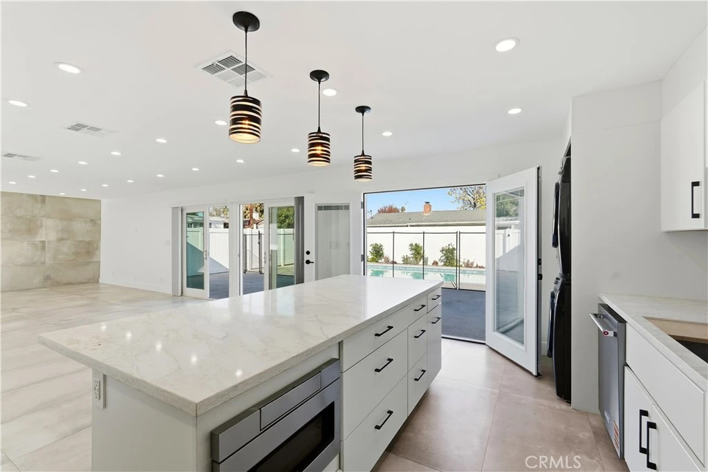 Welcome to an ultra-luxury, newly reconstructed home in the heart of Canoga Park, located just a couple of blocks from the Topanga Mall, The Village, Costco, Amazon Fresh, Fallbrook Plaza, and only minutes from West Hills. This is not a simple renovation—the property was torn down to the frame and rebuilt with all new electrical, plumbing, roofing, kitchen, tile, windows, doors, lighting, fencing, and landscaping. Inside, the home offers three bedrooms and two bathrooms across approximately 1,400 square feet, all designed with a completely open-concept layout and abundant natural light. The living room, dining area, and kitchen share an expansive great-room design illuminated by more than forty recessed lights, complemented by designer island pendants and under-cabinet lighting. The living room opens beautifully to the outdoor areas and pool through two large sliding doors, a set of double French doors, and a picture window that fills the space with sunlight. The designer kitchen is a true showpiece, featuring Samsung Bespoke appliances—including a smart refrigerator with touchscreen—paired with a KitchenAid dishwasher for added convenience. The cabinetry consists entirely of full drawer-style units rather than standard doors, creating a modern and functional layout. An electronic microwave drawer is built into the eight-foot island, and the kitchen is completed with high-end finishes, premium stone and tile, extensive storage, generous prep space, and striking under-cabinet lighting. The wide, open configuration makes the space ideal for entertaining. Throughout the home, premium tile flooring offers a cohesive, modern, and easy-to-maintain finish. Each bedroom includes two windows for natural light, recessed lighting, and custom floor-to-ceiling closets with mirrored doors, interior lighting, and built-in closet systems offering a balanced mix of shelving and hanging space. Two of the bedrooms offer expansive ten-foot-wide closets, while the third features a newly redesigned five-foot closet. Both bathrooms reflect luxury design with floor-to-ceiling designer tile, floating modern vanities, LED anti-fog mirrors, custom glass shower doors, and multiple recessed niches for added storage. Every detail has been thoughtfully selected to create a brand-new, modern, and high-end living experience.
