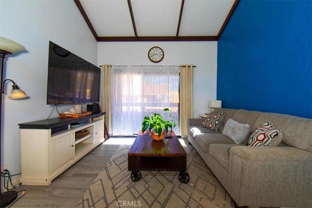 Beautiful, bright corner-unit condo featuring 2 bedrooms and 2 bathrooms. The primary bedroom offers a private en-suite bath and walk-in closet, while the second bedroom is conveniently located near the hallway bath. The spacious living room showcases high vaulted ceilings with wood paneling and abundant natural light. The open-concept kitchen connects seamlessly to the dining and living areas and features stainless steel appliances, a white stove, and an in-unit washer and dryer—ideal for entertaining. Custom features include a wall cabinet bar and a built-in Murphy bed, adding functionality and style. Laminate flooring throughout. Enjoy a private balcony with pool and greenbelt views, along with a small storage area. Two conveniently located parking spaces included. HOA amenities include a pool and spa. Walking distance to shopping, theaters, and restaurants, with nearby hiking and biking trails and easy freeway access. Very unique touches throughout. Move-in ready.