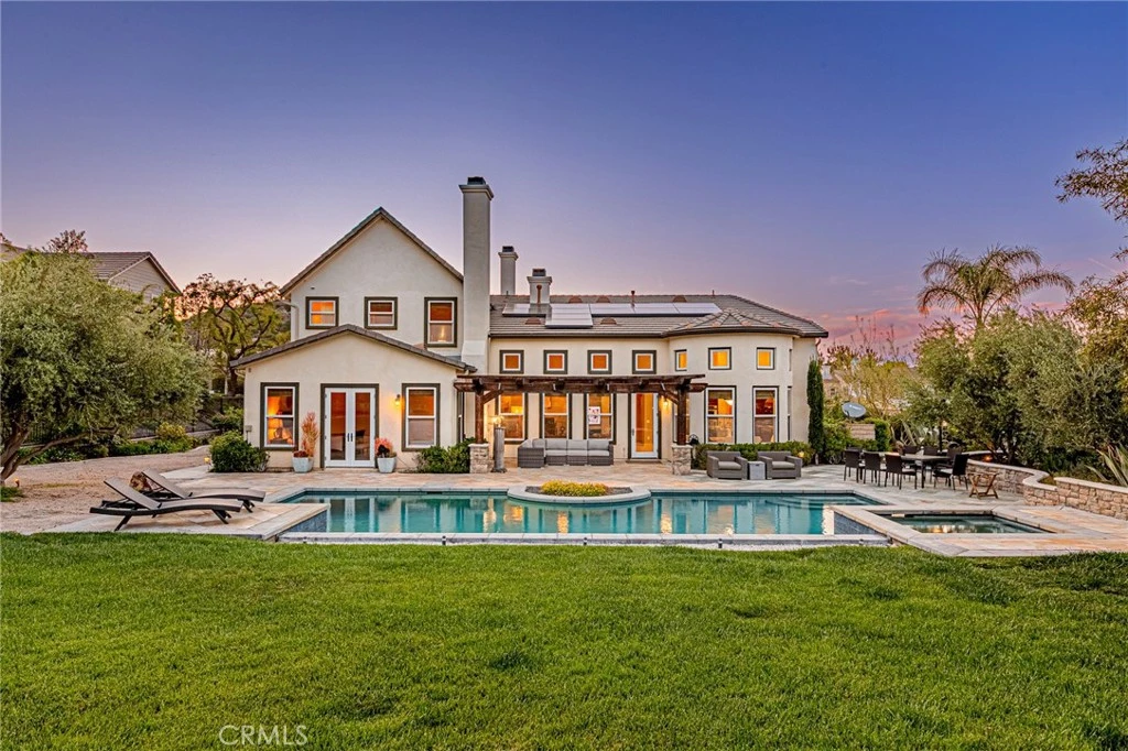 Sensational Sand Canyon Executive Home with Exceptional Pool and Spa Over Half an Acre. Welcome to this spectacularly upgraded Executive home, nestled in the prestigious and scenic Sand Canyon Country Club neighborhood. Located on a quiet cul-de-sac and secured behind a private gate, this residence offers luxury, privacy, and impeccable design throughout. As you arrive, you’re greeted by a separate Casita, perfect as a guest suite, workshop, or maid’s quarters. Step inside the main home and be captivated by the stunning layout, which offers a seamless and natural flow through the living spaces. Elegant travertine flooring with marble medallion, soaring high ceilings, and a cozy fireplace in the living room set the tone for refined comfort, while French doors open to a charming courtyard, perfect for peaceful moments or entertaining. The spacious formal dining room flows into a Chef’s dream kitchen, complete with a Quartz stone island, full designer backsplash, built-in refrigerator, double dishwashers, double ovens, food warmer, and a bright breakfast nook. The highly ungraded adjacent family room features hardwood flooring, a fireplace, and a surround sound system, creating an ideal space for gatherings. The expansive 1st floor level Master suite is a true retreat, boasting a fireplace, walk-in closet, and French doors that open to the serene backyard. The luxurious en-suite bathroom offers a jetted tub, extended separate shower, and elegant finishes. Upstairs, you’ll find a spacious loft and two generous bedrooms, each with its own en-suite bathroom. Two additional well-sized bedrooms are located on the 1st floor level, offering flexibility and convenience. A large individual laundry room with a utility sink, Central Vacuum system, and an attached three-car garage with EV charger add to the home’s functionality. Enjoy the best of Southern California outdoor living in the private backyard oasis, featuring a gorgeous pool, spa, and lush green lawn and trees—perfect for both relaxation and entertainment. The home is also equipped with 36 leased solar panels (only $195/month), low HOA dues, and no Mello-Roos tax. This home is truly a masterpiece—a rare blend of elegance, comfort, and thoughtful design. Seeing is believing—schedule your private tour today!
