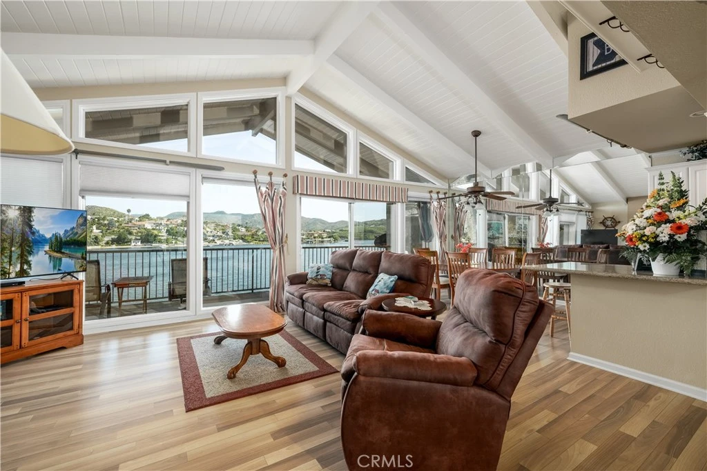 Are you ready to enjoy Main Lake Living with a fully furnished condo AND your own boat slip with a lift...Come check out this beautiful 2 bedroom/2 bath condo located on the desirable Treasure Island. Cruise across the bridge to your own private gated condo association where 36 units sit on an island on the amazing Canyon Lake. This condo is 1 of only 4 of the units with vaulted ceilings and a spacious outdoor balcony to enjoy the stunning 180’ lake views! This condo has been very tastefully remodeled and features newer windows and sliders throughout. The kitchen boasts granite counters, an eating counter and a full size washer and dryer are found here under the counters but still provide plenty of cabinet space. The family room features a wood burning fireplace and opens to the dining area and both enjoy a full wall of windows to see out to the beautiful main lake. There is a 2nd bedroom with a mirror wardrobe and the large window provides a view of the gazebo and just past that more main lake views. The guest bathroom is located right across the hall. The primary bedroom is very spacious and features a walk in closet with organizers and has sliding patio doors for full views of the lake. There is a shower and bath combo and a linen cabinet. Upstairs living is the way to go with just 2 steps up for you to enjoy a single story residence. Each unit has a one car garage and this one has a pull down ladder and a large storage area along with an assigned parking space and there are plenty of guest parking spaces. Don’t let that second association scare you, what it provides you just can’t beat it. Enjoy easy living as your weekly gardner takes care of the beautiful landscape surrounding you, relax at the pool that you never have to clean yourself or work out in the gym area at no cost. Don’t forget you have your own assigned boat slip as well as your water and trash bills included. The condos at Treasure Island are truly an amazing place to call home or make a vacation home.
