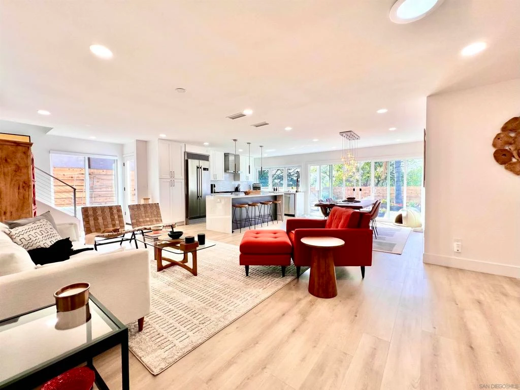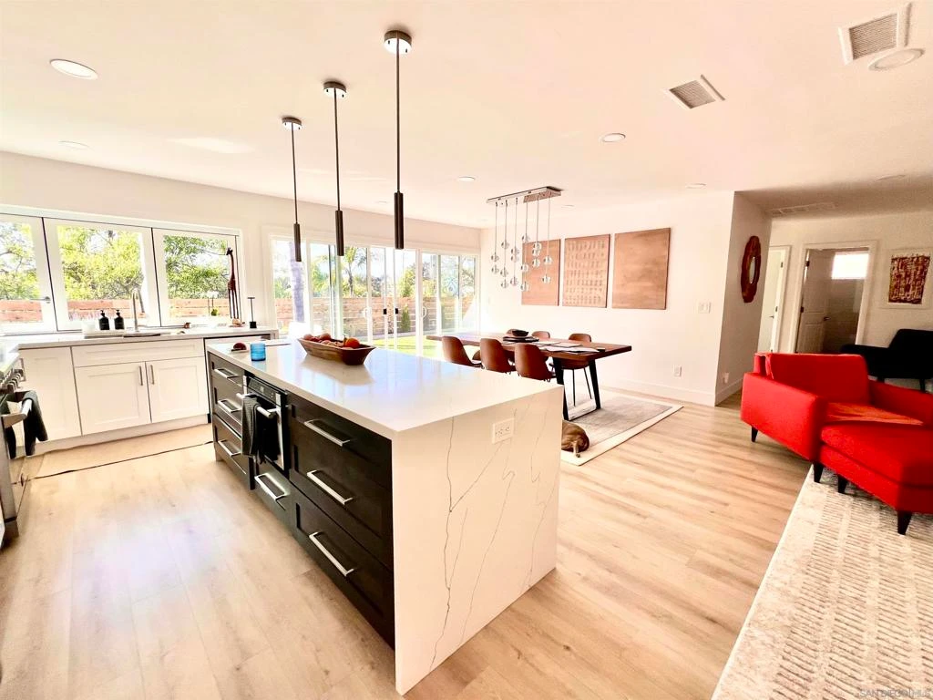 Welcome to coastal living at its finest in the heart of Cardiff by the Sea. This beautifully designed three-bedroom home with an optional fourth bedroom or office blends contemporary beach style with timeless Cape Cod charm, creating a truly one-of-a-kind residence. The wide-open floor plan is light, bright, and airy, filled with natural light and designed for effortless indoor-outdoor living. Large sliding glass doors open to an inviting entertaining patio surrounded by lush landscaping, perfect for hosting or relaxing on warm coastal days. The chef’s kitchen is equipped with high-end appliances, a large quartz island with waterfall end caps, quartz countertops, and classic shaker cabinetry, offering both style and functionality for families and gatherings alike. High ceilings throughout enhance the sense of space, while beautiful light oak flooring adds warmth and sophistication across the home. The bathrooms are thoughtfully designed with stunning high-end finishes, creating spa-like spaces throughout. With ocean views and breathtaking sunsets, this property captures the essence of Southern California coastal living. Located in a highly desirable family-friendly neighborhood, this home offers the perfect blend of comfort, design, and lifestyle, making it an ideal retreat for everyday living or unforgettable summer getaways.