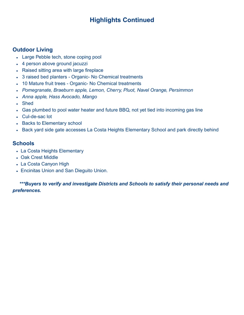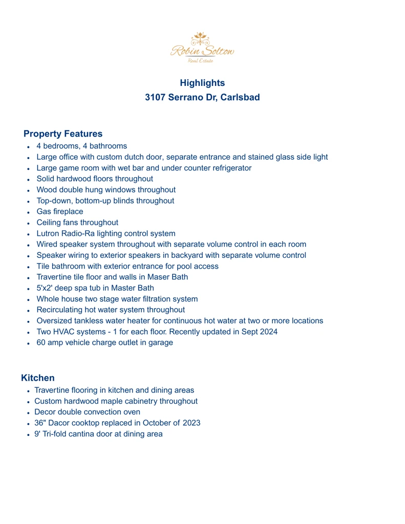 Welcome to this beautifully designed home in the highly sought-after La Costa area of Carlsbad, where comfort, functionality, and charm come together in a truly inviting setting. Ideally located on a quiet cul-de-sac, 5 miles from the beach and surrounded by scenic hiking trails, this home offers the perfect balance of outdoor lifestyle and everyday convenience. Backing directly to La Costa Heights Elementary, the location provides both privacy and a strong sense of community. Step inside to find a warm and thoughtfully crafted interior, featuring solid wood doors and double-hung wood windows throughout that fill the home with natural light while adding timeless character. A whole-house, two-stage water filtration system enhances everyday living. The custom floor plan offers both versatility and space, with three generously sized bedrooms upstairs and an additional bedroom downstairs—ideal for guests or multigenerational living. A standout feature is the expansive office, complete with its own private entrance through a custom Dutch door and accented by a beautiful stained glass side window, making it perfect for a home-based business, creative studio, or quiet retreat. Custom hardwood maple cabinetry is carried throughout the home, blending style with function. The kitchen is designed for both daily living and entertaining, featuring travertine flooring and a premium Dacor double convection oven and 36" cooktop. The spacious game room provides a perfect place to gather, complete with a wet bar and under-counter refrigerator for easy hosting. Step outside through the 9-foot tri-fold cantina door and into a backyard designed for both relaxation and entertaining. Enjoy the PebbleTec-finished pool, soothing Jacuzzi tub, and a large outdoor fireplace that creates a welcoming atmosphere year-round. The yard also includes three organic raised garden beds and ten fruit trees, adding a touch of sustainability and natural beauty to this already impressive space. With its unique architectural details, flexible layout, and prime location, this home presents a rare opportunity to experience the best of North County coastal living.