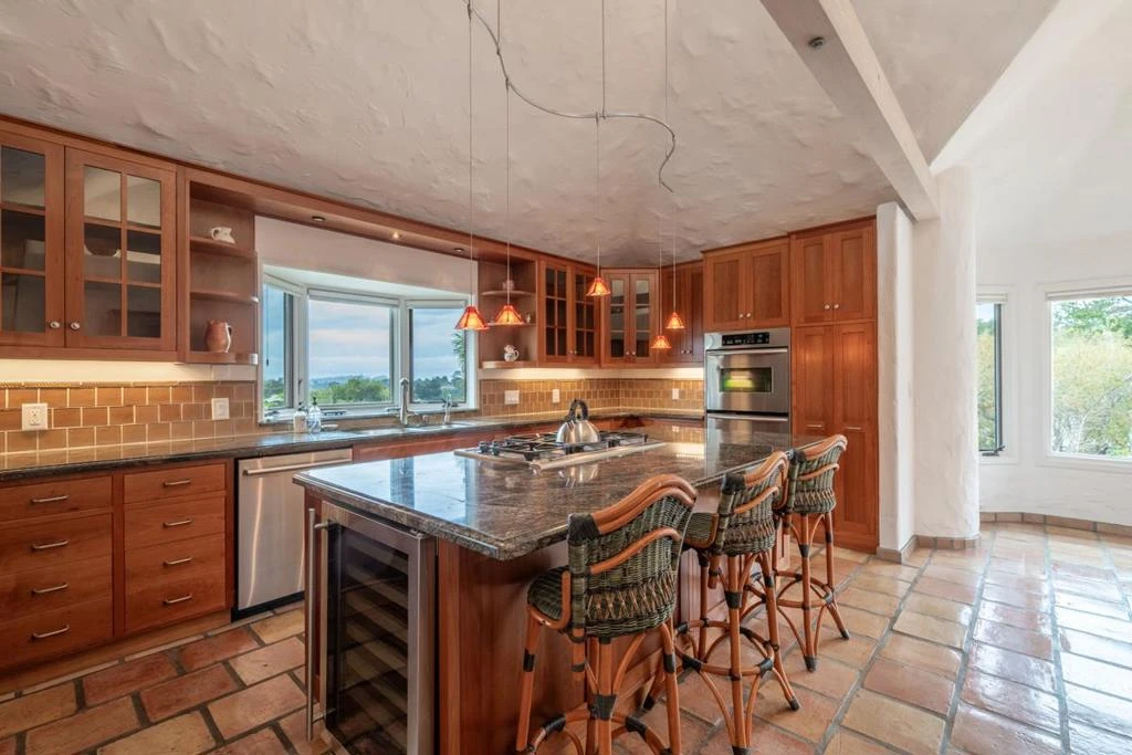 Welcome to a sun-kissed retreat in Rancho Rio Vista, where Mediterranean charm meets resort-style living. This warm and inviting estate offers over 3,400 sq.ft. of character and comfort in the 3 bedroom/3 bath main house, and a charming studio apartment above the garage ideal for guests or creative use on over an acre of land. Classic tile floors, graceful archways, skylights and soaring ceilings flow throughout the home creating a light and airy environment. The living room features a gas log fireplace, open-beam ceilings, French doors and sunroom with sweeping mountain views to the south. The kitchen is designed for gourmet cooking, complete with island, breakfast bar and nook, double ovens, plenty of storage and wine fridge, while the formal dining room offers an elegant and intimate entertaining space. The ground-floor primary bedroom suite is a peaceful haven with hillside views, spa-like bath and a secluded deck with private hot tub access. Outside features include a water feature, lush gardens blooming with roses, fig and fruit trees, rosemary and lavender, hillside olive orchard, and large south-facing deck with barbecue area and space to relax or dine al fresco. With a 3-car garage, owned solar, air conditioning and generator, this is Carmel living at its finest.