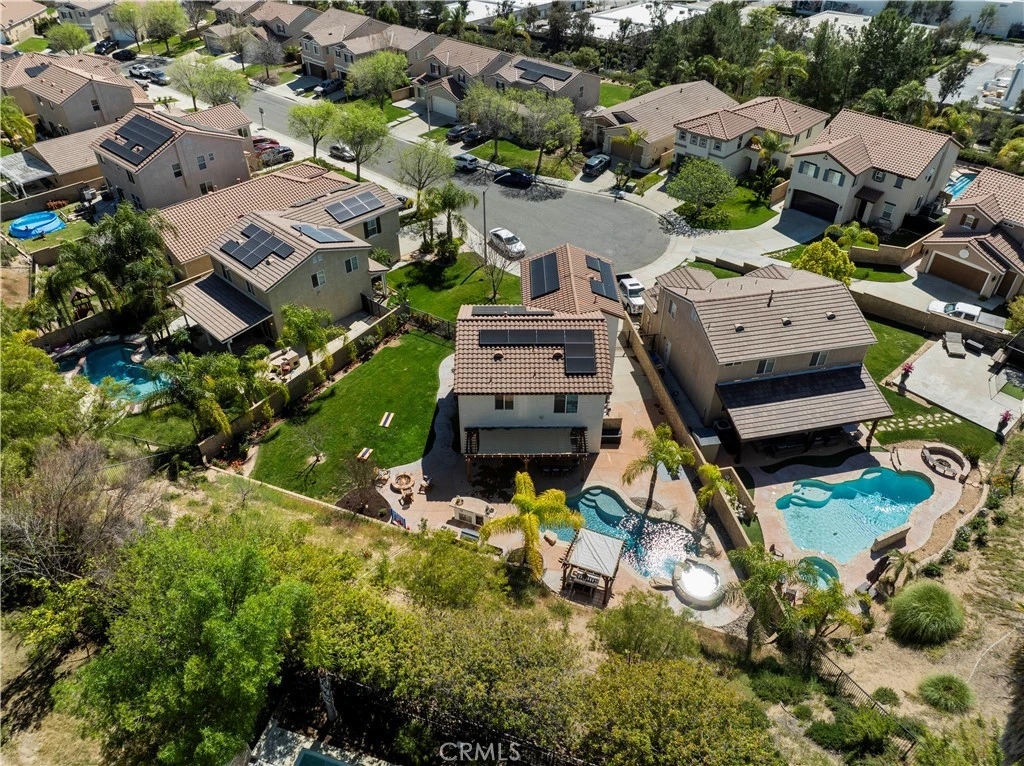 Entertainer's dream home tucked away at the end of a quiet cul-de-sac on a spacious private lot with a stunning pool and spa. Step through the covered entry and be greeted by beautiful luxury plank flooring that flows throughout the main level, creating a bright and open layout perfect for modern living. The chef’s kitchen is a showstopper, featuring quartz countertops and backsplash, stainless steel appliances, a breakfast bar, slow-close cabinets with ambient lighting, and a pantry. The kitchen opens to a lovely family room and a separate dining area, offering an ideal flow for everyday living and entertaining. The main floor also includes an updated half bath and a separate laundry room. Upstairs, the spacious primary suite is a true retreat with a walk-in closet and an en suite bath featuring dual sinks, a walk in shower, and a relaxing soaking tub. Two additional light and bright bedrooms with ceiling fans are complemented by a beautifully remodeled full bath. An expansive loft offers flexible living space with endless possibilities. Perfect as a media or movie room, it could easily serve as a home office, game room, playroom, or even a fourth bedroom. With ample square footage, high ceilings, and natural light, the loft feels open and airy while providing a comfortable space for family gatherings, entertainment, or work from home needs. Step outside to a private backyard that truly feels like a luxury resort. Thoughtfully designed for both entertaining and relaxation, the space features multiple seating areas perfect for conversation, dining, or simply unwinding. A cabana style sunbathing area provides the perfect place to soak up the sun, while the sparkling pool with a waterfall spa invites endless enjoyment. The built-in BBQ with seating and refrigerator makes outdoor entertaining effortless. A generous grassy area offers plenty of room for games, gatherings, or hosting special events, all while enjoying exceptional privacy. As evening falls, beautiful lighting twinkles throughout the yard while the glow of the gas fire pit creates the perfect ambiance after sunset. A whole house fan and fully owned solar add energy efficiency and value, and with a low HOA and no Mello Roos, this is the absolute perfect home. Conveniently located near shopping, schools, parks, and freeway access, it offers the ideal blend of comfort, flexibility, and resort-style outdoor living.
