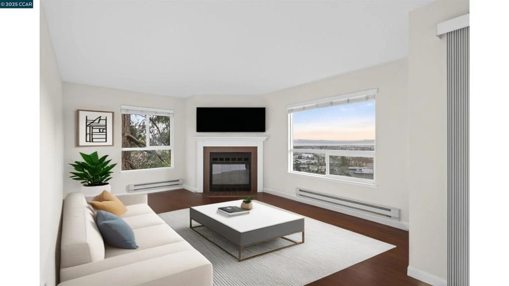 Welcome to this beautifully updated condo, where comfort meets style—and every sunset feels like a postcard. This light-filled 2-bedroom, 2-bath home features a spacious, open layout with modern finishes and luxury vinyl flooring throughout. The kitchen features new stainless-steel appliances, quartz stone countertops, and white cabinetry—perfectly connecting to a bright dining space and cozy living room with oversized windows and a charming fireplace that invites you to unwind. The master bedroom is a relaxing space with a large mirrored closet and an updated private bath. The second bedroom feels just as cozy and bright. Both bathrooms feature new lighting, modern fixtures, and clean finishes, making them feel fresh and welcoming. Step outside to your private covered balcony and soak in the peaceful hillside and Bay views—ideal for your morning coffee or catching the golden glow of sunset. Located in the sought-after Castro Valley School District. Close to shopping, dining, and parks. *Some of the pictures are virtually staged*