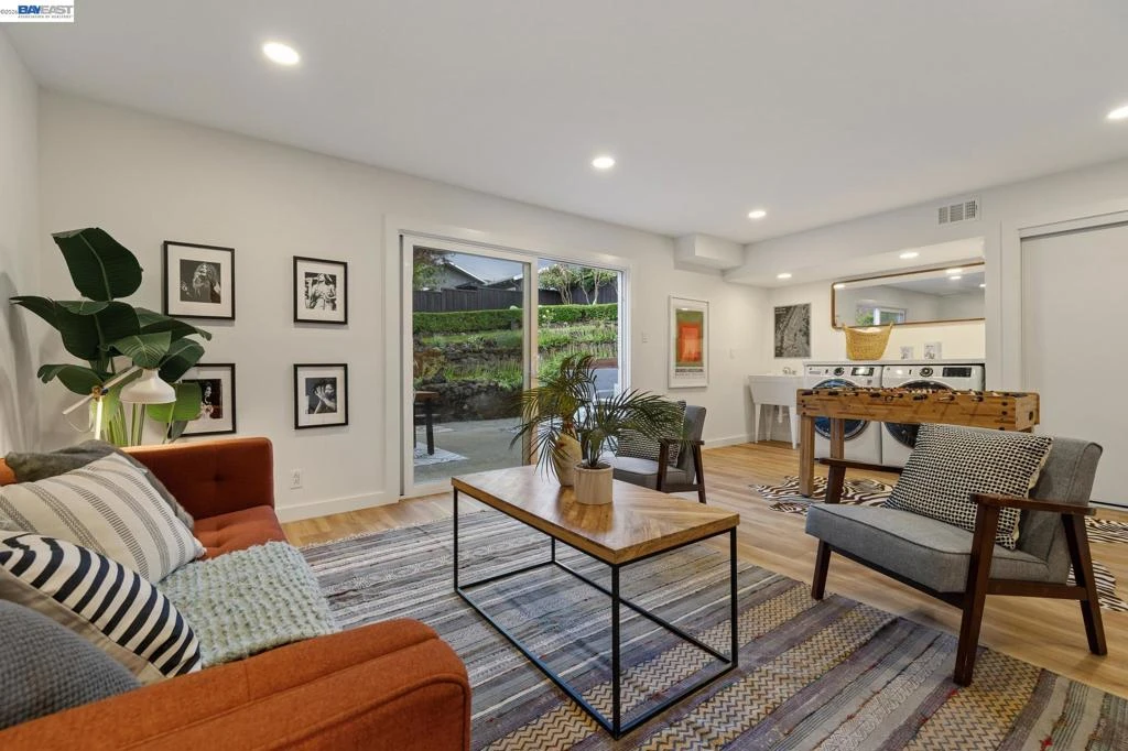 The beautiful East Bay hills are the backdrop to this stylishly upgraded 3+BD/2.5BA Mid-Century Castro Valley home on a quiet, coveted cul-de-sac near Lake Chabot. Throughout the 1774 SQFT home, abundant windows and glass doors fill the rooms with sunlight and verdant views. Relax or entertain in the spacious living and dining area with fireplace, picture window to the park, and sliding doors for seamless indoor/outdoor living. Hardwood floors extend into the updated kitchen with new appliances, countertops, cabinetry, and a bright breakfast nook overlooking the landscaped backyard. The sleeping wing features a primary suite with hillside views and ensuite bath, plus two generous bedrooms with large closets near a full hall bath. Downstairs offers interior access to the two-car garage, laundry with sink, powder room, and a flexible space ideal as a family room or office, with sliding doors to the patio. The expansive yard includes raised garden beds, patios for dining, level lawn, and a secluded garden retreat. Close to Lake Chabot, A+ schools, BART, and downtown Castro Valley.