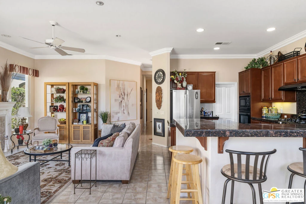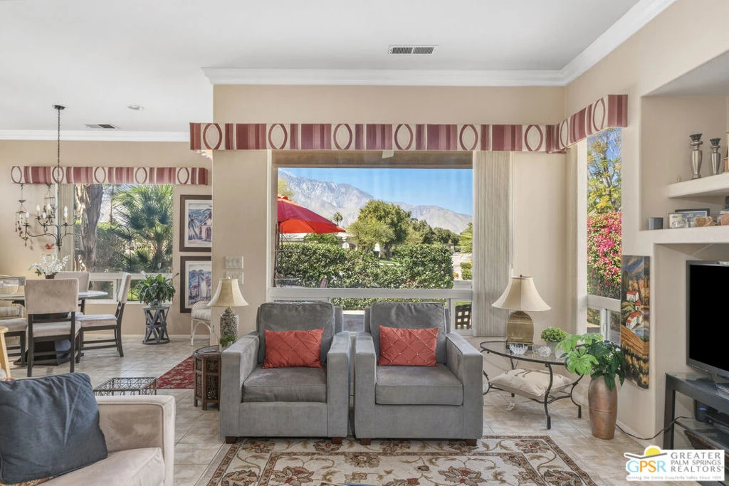 Located in the prestigious Desert Princess Country Club, this beautifully maintained desert retreat offers 2 bedrooms and 2.5 bathrooms across approximately 1,711 sq ft of living space with stunning western mountain views. The thoughtfully designed open floor plan features a spacious living room with a cozy fireplace, elegant crown molding, and a bright kitchen complete with granite countertops, backsplash, and a walk-in pantry. Both bedrooms are generously sized primary suites with walk-in closets, creating ideal comfort and privacy for residents or guests. Additional highlights include an attached two-car garage with storage and turnkey furnishings. Residents enjoy resort-style amenities within the 24-hour guard-gated community, including a 27-hole championship golf course, 33 swimming pools, tennis courts, fitness center, and vibrant clubhouse with dining and social events, all just minutes from shopping, dining, and Palm Springs International Airport.