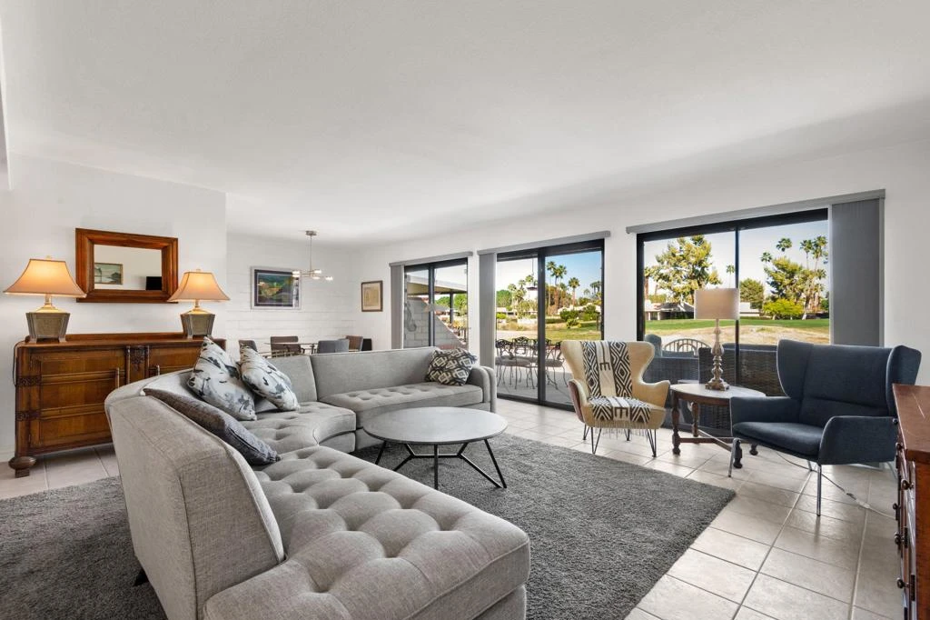 INCREDIBLE PRICE for effortless desert living in the highly desirable Cathedral Canyon Country Club! This bright and inviting 2-bedroom, 2-bath condo welcomes you with a lush private courtyard and spacious interior filled with natural light. Vaulted ceilings, fresh paint, new blinds, updated lighting, and three sets of sliding doors create seamless indoor/outdoor flow. Enjoy tranquil golf course, pond, and mountain views from the expansive rear patio--perfect for relaxing or entertaining. The open living and dining areas connect to a beautifully remodeled kitchen featuring white cabinetry, new appliances, updated lighting, sleek countertops, tile backsplash, and a charming breakfast nook with courtyard access. The primary suite offers vaulted ceilings, generous closet space, patio access, and an updated ensuite bath. The guest bedroom features its own remodeled private bath and courtyard access, ideal for guests. Additional highlights include a full-size stacked washer/dryer, pantry storage, direct access to a two-car garage, leased solar, and updated HVAC. Community amenities include pools, spas, and beautifully maintained grounds. Ideally located near shopping, dining, golf, and downtown Palm Springs. Exceptional value in a premier golf course community!