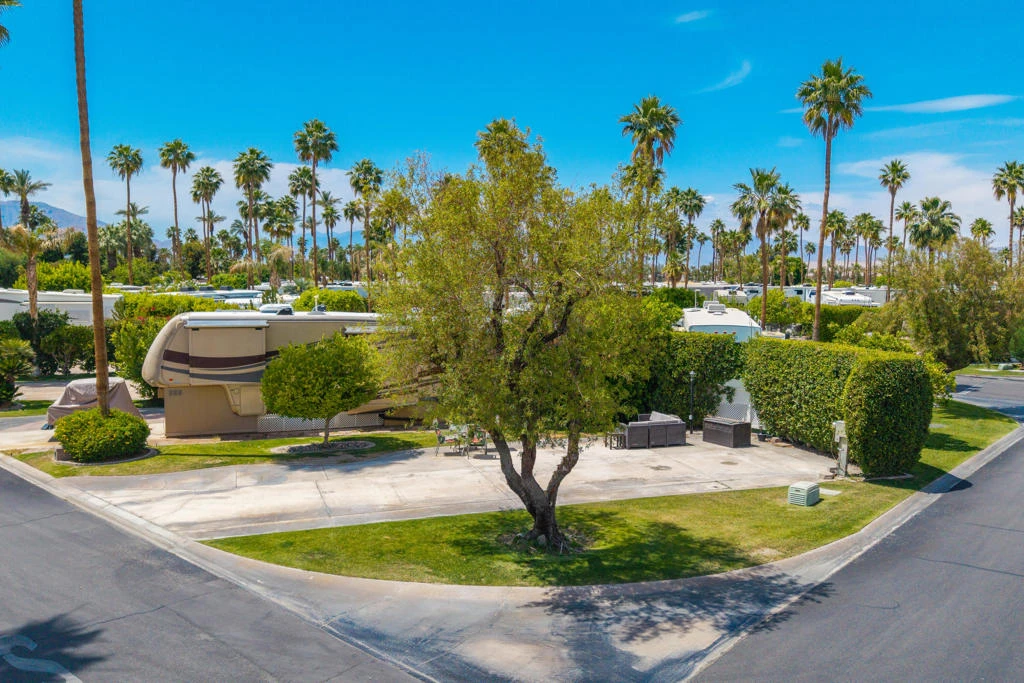 Discover an exceptional opportunity to own a truly beautiful and private interior corner lot. This serene property boasts mature hedging to the rear, creating a secluded oasis. Lush greenbelts and mature trees on both sides further enhance the sense of privacy and create a verdant and tranquil setting. Enjoy the convenience of being located close to Satellite C and the vibrant La Palma Clubhouse, offering easy access to amenities and activities. Outdoor Resorts Palm Springs is a Five Star RV Resort Community combining luxury with affordability. It is a guard gated resort that sits on 137 beautifully landscaped acres with 27 holes of executive golf, 10 tennis courts, 13 pickleball courts, 8 swimming pools, a fully equipped fitness center, espresso bar, sports bar, beauty salon/barber shop, full-service restaurant, convenience store, 2 club houses, activities, special events and so much more.