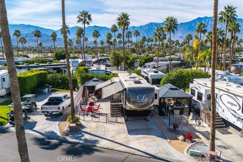 Beautifully expanded Lot 303 is located on the east side of Outdoor Resorts Palm Springs an All-Ages Active Resort Community. The lot features a newly constructed gazebo with electricity, curtain surround for privacy, tv mount and TV, a firepit table with 4 chairs and cushions, vinyl fencing on both sides and a 2018 DRV Mobile Suite Aire M-38, 39'11" in length, with custom wood steps w/storage & wood railing, soft side covers for lower part of fifth wheel. Interior Fifth Wheel Features Include: Corian countertops, center island, stainless steel farmhouse sink, 3 burner Furrion stove, convection microwave, molded tile backsplash with Jute edging, residential fridge/freezer with ice maker, pendant lights over the island, pantry, vinyl wood look flooring expandable wood table for 4, rear living room with 3 recliners, ceiling fan in living room, large windows let in the natural light, sleep number king size bed, 8 drawer dresser, 3 additional storage cabinets, Corian countertops in the bathroom with dual sink vanity, residential toilet, large shower area, stacked Splendide washer/dryer, large closet and plenty of storage space. Outdoor Resorts Palm Springs spans 137 beautifully landscaped acres and offers an unmatched resort lifestyle with 27 holes of executive golf, 10 tennis courts, 13 pickleball courts, 8 swimming pools, a fully equipped fitness center, sports bar (19th Hole), on-site salon/barber shop, café, and two clubhouses with year-round activities, events, and entertainment. Whether you’re seeking an active social scene or a peaceful desert retreat, this is more than a lot—it’s a lifestyle.