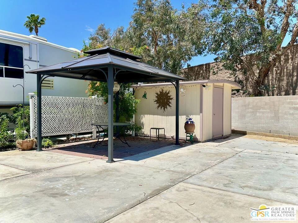 Located on the highly desirable year-round occupancy side of Desert Shadows RV Resort, this premium RV lot offers the rare opportunity to enjoy full-time desert living, something not available throughout the entire resort. With spectacular views of the surrounding mountains, clubhouse, greenbelt, and pond, this lot is truly one of a kind. You won't find a condo or small home in the Palm Springs area at this price point where you own the land, making this an unbeatable value whether you're seeking a seasonal escape, a full-time residence, or a long-term investment. Beautifully landscaped and thoughtfully equipped, the lot features a privacy wall at the back, a large shed for storage, and a spacious gazebo perfect for outdoor dining, lounging, or entertaining. Desert Shadows is a vibrant gated 55+ community with 460 individually owned lots and some of the best amenities in the Coachella Valley. Residents enjoy access to six heated pools, including an Olympic-sized lap pool and an indoor pool, along with spa and sauna facilities. The resort also features sunken, lit tennis and pickleball courts, indoor shuffleboard, a full gym, a woodshop, card and hobby rooms, a putting green, a dance studio, multiple picnic areas, and a grand 16,000 sq. ft. ballroom hosting events and activities year-round. Low monthly HOA dues of just $420 include water, trash, sewer, basic cable, clubhouse Wi-Fi, recycling services, and professional landscaping around your unit, providing convenience and peace of mind. Don't miss this exceptional opportunity to own a prime lot in one of the desert's most well-appointed and welcoming communities. Contact us today to schedule a tour or request more information!