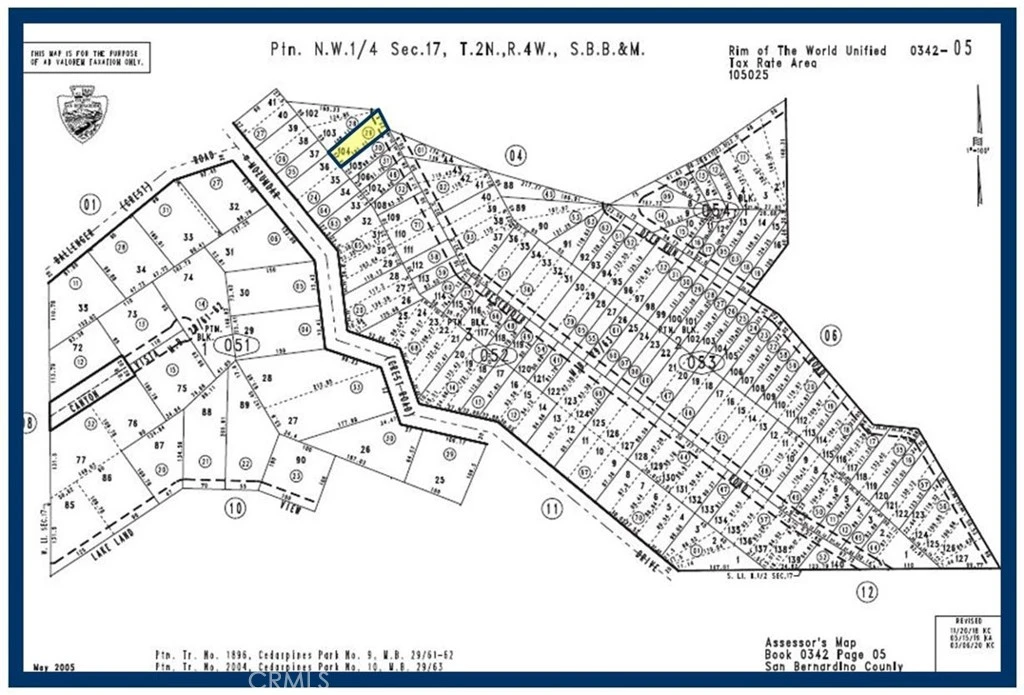 Lot 104 Tract 2004 (APN: 0342-052-29) GPS: 34.260891, -117.327711 This mountain lot is in the rural mountain community of Cedarpines Park, CA. The lots sits an at approximate elevation of 4900 feet an is 1.24 miles north of the downtown community. According to the San Bernardino County, the property is zoned CF/RS-14M. This zoning is Single Residential with 14,000 sq ft minimum lot sizes. Buyer should verify all utilities and access. Use GPS to locate the property, GPS: 34.260891, -117.327711