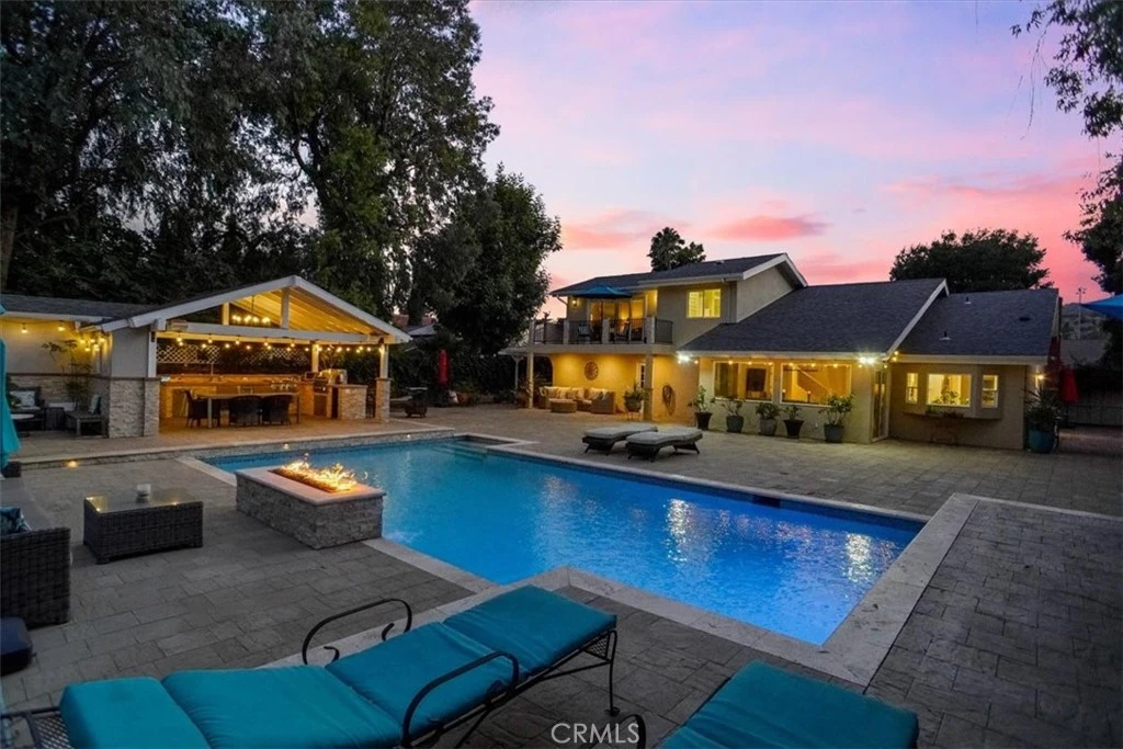 Exquisite Remodeled Entertainer’s Dream Home in Prime Chatsworth Location! Nestled on a rare double cul-de-sac in one of Chatsworth’s most sought-after neighborhoods, this fully remodeled and thoughtfully redesigned two-story stunner offers the ultimate in style, space, and luxury. With 5 bedrooms, 5.5 bathrooms, and over 3,000 sq. ft. of refined living space on a massive 17,800 sq. lot, this home is truly one-of-a-kind. From the moment you arrive, you’ll be captivated by the serene privacy of this exceptional property. The resort-style backyard is a showstopper—an entertainer’s paradise featuring a sparkling pool, elegant fire feature, and a custom wood-beamed outdoor pavilion with full kitchen, built-in BBQ, pool bathroom, and outdoor shower. The expansive yard even offers ADU potential, adding even more value and versatility. Inside, soaring vaulted ceilings and thoughtful updates greet you at every turn. The designer chef’s kitchen boasts quartz countertops, abundant cabinetry, stainless steel appliances, a Viking range with pot filler, and a cozy breakfast area. The adjacent formal dining area overlooks the lush backyard, making every meal feel special. Upstairs, a private primary suite awaits, complete with wood-beamed ceilings, a view balcony, walk-in closet, and a spa-like en suite bath featuring dual sinks, a soaking tub, and a separate shower. The main level offers 4 additional bedrooms, including a Jr. Primary suite -ideal for multigenerational living or guest accommodations, plus main level has all beautifully remodeled bathrooms. Additional highlights include a huge laundry/mud room, 3-car direct access garage, recessed lighting, dual pane windows, crown molding, tank-less water heater, newer roof, and updated pool equipment and plaster (approx. 5 years ago). Fruit trees, central air & heat, and designer upgrades throughout complete this exceptional offering. This rare gem combines unmatched luxury, functionality, and charm—a true entertainer’s dream home with nothing else quite like it on the market.