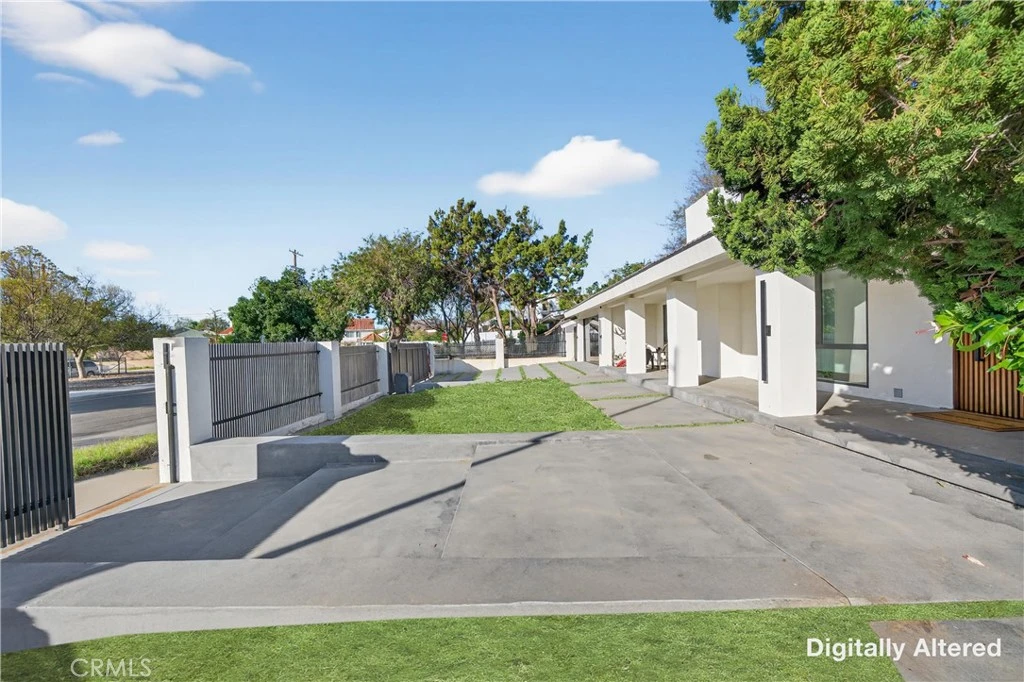 Welcome to this fully renovated single-story gated estate on an approximately 0.28-acre lot, offering modern luxury and seamless indoor-outdoor living. This 2022 move-in-ready home features 5 bedrooms and 3.5 designer bathrooms with custom white tile flooring throughout the main living areas. The chef’s kitchen strikes with an oversized island, Wolf appliances, Sub-Zero refrigerator, Cove dishwasher, custom cabinetry, and premium finishes. A full wall of Fleetwood sliding glass doors opens to the private backyard, creating a true indoor-outdoor experience. The living room features a sleek electric fireplace, while the primary suite and an additional bedroom offer direct backyard access. The primary bedroom includes a walk-in closet and spa-inspired bath with aromatherapy steam shower and smart bidet. Bathrooms are individually designed, including one with a jacuzzi tub and another with dual indoor-outdoor access, ideal for pool use. The backyard offers a resort-style pool with waterfall, lush landscaping, built-in speakers, room for an ADU, and gated rear access. Additional highlights include new plumbing, electrical, HVAC, whole-home water filtration, integrated sound system, security cameras, and an oversized garage with custom cabinetry and loft storage.