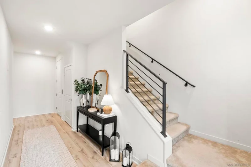 Located in the Pinnacle development at Millenia in Otay Ranch, this corner-unit condo offers thoughtful design, functional living space, and expansive outdoor areas with mountain views from the rooftop deck. The home features an attached 2-car garage with storage shelving, EV plug-in, and a private elevator for easy access from the entry level to the rooftop deck. The main living floor features 3 bedrooms, 2 bathrooms, a laundry closet, living and dining areas, and a private balcony. 12-foot ceilings, Beachwood-style flooring, and an abundance of natural light. The kitchen is finished with quartz waterfall countertops, stainless steel appliances, a custom backsplash, and a gas range. The primary suite includes a walk-in closet, dual sinks, soaking tub, and a walk-in shower. The top level features a loft/den that can function as an optional fourth bedroom, with a porcelain-tiled fireplace and direct access to the rooftop deck. The corner location provides views of the surrounding mountains, and with over 750 square feet of outdoor space between the two balconies, there is plenty of room to relax or entertain. Additional features include smart thermostats for the furnace and air conditioning, recessed lighting, and ceiling fans throughout. Residents of Millenia have access to a community pool, spa, and BBQ area, along with nearby parks, trails, schools, restaurants, and approximately 300,000 square feet of retail and dining within walking distance.