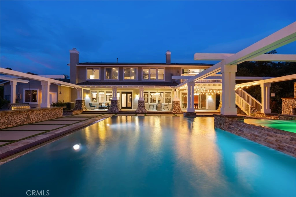 Welcome to Belleville Estates, an exclusive enclave featuring just four homes that epitomize peace and tranquility. Situated at the end of a picturesque, tree-lined cul-de-sac, this prime location offers both privacy and serenity. Upon entering, you are greeted by elegant brand new wide plank laminate flooring and a dramatic staircase accented with dark wood. The living room boasts a shared fireplace with the adjacent billiard room, creating a warm and inviting atmosphere. The well-appointed kitchen, open to the family room, features Madagascar granite countertops, two expansive islands with ample counter space, breakfast seating, and an additional sink. Culinary enthusiasts will appreciate the six-burner Viking gas stove with a full-size vent hood, built-in refrigerator, microwave, and double oven. A walk-in pantry and a breakfast area by a large picture window provide convenience and charm. The butler's pantry, complete with a built-in wine fridge, seamlessly connects to the formal dining room. The ground floor includes two en-suite bedrooms and a powder room, offering comfort and accessibility. Upstairs, the master suite is a true retreat, featuring dual walk-in closets and a custom-built balcony with stunning backyard and mountain view. The upper level also comprises three additional bedrooms and a bonus room, providing ample space for family and guests. The backyard is a standout feature of this property. It includes a spacious covered patio with Mission-style lighting, a custom pebble tech salt-water infinity pool, a 12-person spa, and an inviting outdoor fireplace. The expansive granite bar top with a built-in BBQ is perfect for entertaining. Additional outdoor amenities include walking paths, a gas fire pit, a fountain, and fruit trees. This home is equipped with a solar power system, which is owned outright, a newer tankless water heater, and dual HVAC systems, ensuring modern efficiency and comfort. Belleville Estates is truly an extraordinary place to call home. WELCOME HOME