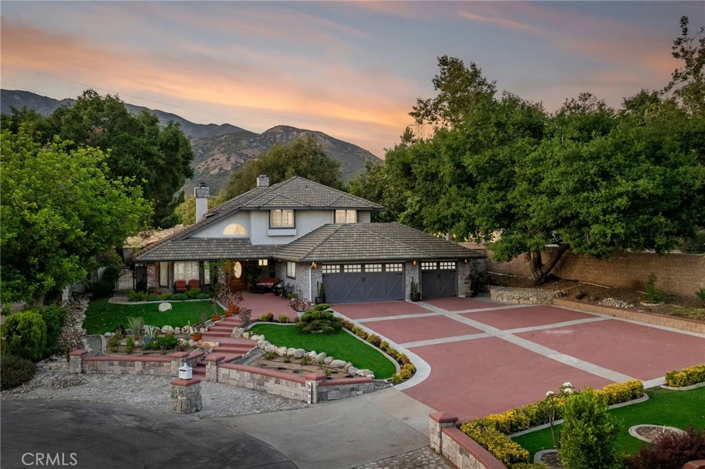 Blaisdell Ranch | Prime End-of-Cul-De-Sac Estate with Expansive Views & Entertainer’s Backyard. Tucked away at the end of a quiet cul-de-sac in the coveted Blaisdell Ranch community, this exceptional residence sits on a deep, private lot framed by mature landscaping, extensive stonework, and a stately oak tree that anchors its elegant curb appeal. An oversized driveway and a welcoming covered front porch set the stage for the refined living spaces within. Step through the front door to a tiled entryway that opens to a formal living room with a beveled glass bay window and tile flooring. Just beyond, a family room impresses with a towering floor-to-ceiling fireplace, recessed lighting, and opens to a sunken lounge, a warm and inviting space featuring a built-in wet bar with stone counters, a comfortable sitting area, and arched windows framing serene mountain views. The remodeled kitchen is a showpiece, designed with rich cherrywood cabinetry, granite countertops and backsplash, stainless steel appliances, a center island, and an eye-catching double tray ceiling with recessed lighting. The adjacent breakfast nook is surrounded by windows and topped with a matching tray ceiling, bathing the space in natural light. A formal dining room with a recessed, coffered ceiling and chandelier provides an elegant setting for entertaining. A charming brick-floor bonus room offers the perfect transition to the backyard, accessible through a sliding glass door. The main level also features a private office, a bedroom, a ¾ bathroom, and a spacious laundry room with direct access to the three-car garage. Upstairs, the expansive primary suite is a true retreat, offering a brick fireplace and French doors that open to a large private balcony with panoramic views. The remodeled ensuite bath features dual vanities with stone countertops, a dedicated makeup station, a soaking tub framed by shuttered windows, a walk-in shower, and a generous walk-in closet. Two additional upstairs bedrooms share an updated hall bathroom. The backyard is a park-like sanctuary, professionally landscaped with meandering paver walkways, vibrant greenery, and a central lawn surrounded by curated garden beds. Entertain effortlessly with a koi pond, multiple seating areas, and a built-in barbecue under a covered pergola, perfect for dining al fresco. With no rear or side neighbors, full block privacy walls, and lush natural screening, this outdoor space offers seclusion and tranquility.