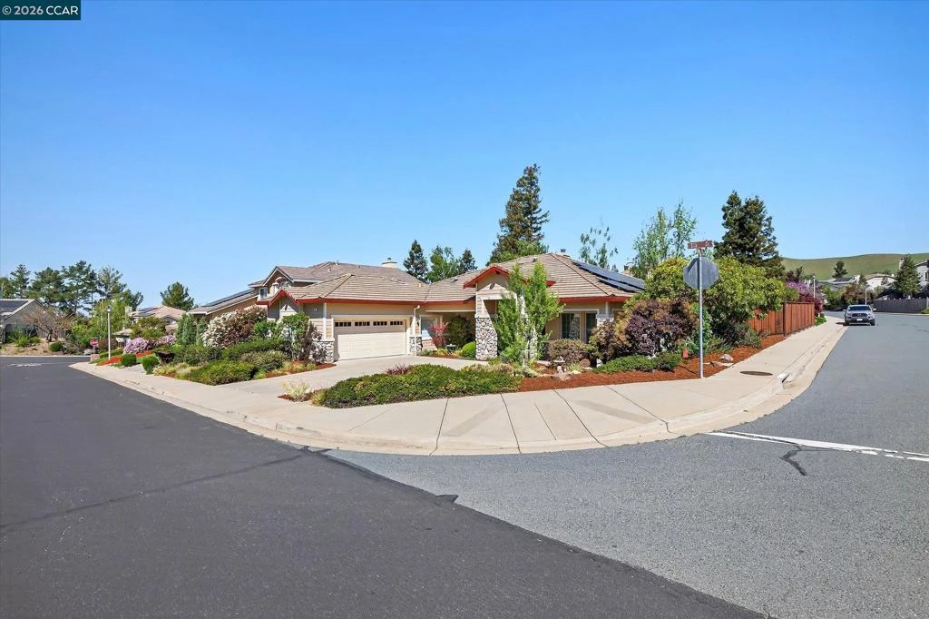 Beautifully maintained single-story home on a spacious corner lot in a quiet cul-de-sac. Charming curb appeal with covered entry, stone-wrapped columns, front porch with sitting area, and landscaped yard featuring mature shrubs and natural stone pathways. Inside offers soaring ceilings, abundant natural light, large picture windows, and an open-concept layout connecting the kitchen, family room and living/dining areas. Kitchen includes granite countertops, stainless steel appliances, a five-burner gas range, double ovens and a center island with seating. The family room features a gas insert fireplace, sliding glass door and custom built-in cabinetry with integrated lighting, display shelving and a built-in desk. Built-in dry bar with glass-front cabinetry and wine refrigerator. Spacious primary suite with private patio access and designer-appointed bathroom with double vanity, glass shower and walk-in closet. Two custom flagstone patios enhance indoor-outdoor living. Additional features include a two-car garage with extra space, laundry room with sink, Hunter Douglas & Graber blinds, Andersen windows, owned solar and newer HVAC. Private backyard with mature trees, a mix of drought-tolerant and traditional landscaping. Ideally located near trails, parks and downtown.
