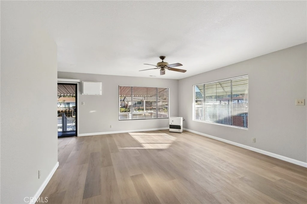 At the end of a peaceful cul-de-sac, this inviting 2-bedroom, 2-bathroom Clearlake Keys home offers both comfort and functionality. The interiors boast brand-new flooring throughout and fresh paint. Inside, you'll find a generous living room that seamlessly connects to a dining area. The efficient galley kitchen is designed with plenty of counter space for preparing favorite meals. Step outside onto the recently updated deck, perfect for entertaining guests or relaxing with morning coffee as you take in channel views and abundant lake wildlife. The covered deck overlooks the tranquil channel, offering a peaceful retreat and easy access via gangplank to your private dock and boat slip. Access to Clear Lake via the channel. Amenities abound, including convenient RV or boat parking and a spacious two-car garage with driveway. The garage features washer-dryer hookups, laundry sink, workbench, and cabinets. Outdoor spaces feature a fenced backyard equipped with an irrigation system. Two storage sheds provide extra room for tools, gardening equipment, or seasonal items. Whether you're looking for a getaway or an everyday home, this property promises versatility and an ideal lakeside lifestyle.