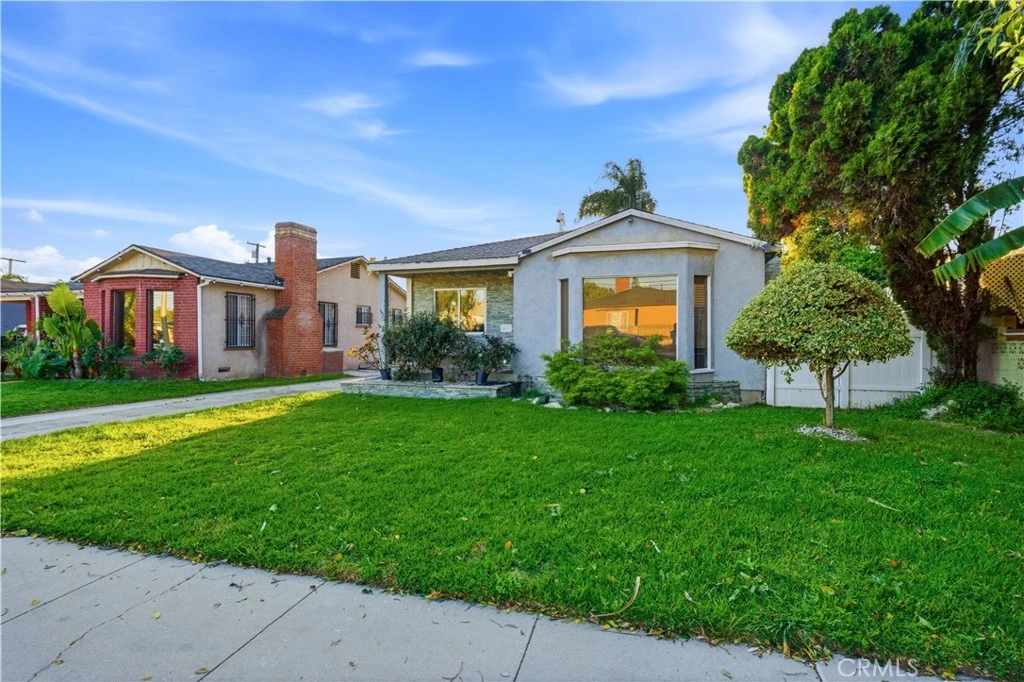 This 4-bedroom, 2-bath home offers approximately 1,390 sq ft of living space on a 7,002 sq ft lot. A covered front porch leads into the open living and dining area featuring a fireplace and large windows providing natural light. The kitchen includes granite countertops, white cabinetry, tile backsplash, and a center island for food prep and storage. The primary bedroom features recessed lighting, a walk-in closet, and an en-suite full bathroom with soaking tub, and separate glass-enclosed shower. A ¾ hall bathroom serves the additional bedrooms. Interior spaces include updated flooring and ceiling fans in multiple rooms. The backyard includes a grass area, patio space for outdoor seating or dining, an above-ground spa, and a grapefruit tree. The long driveway provides access to a detached 2-car garage with additional off-street parking. Located near neighborhood parks, shopping centers, dining options, and major transportation routes.