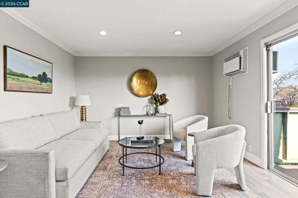 Modern Sophistication at 1133 Meadow Lane. This top-floor residence in a secure gated community offers a seamless blend of style and transit-oriented convenience. The light-filled interior is defined by contemporary wide-plank flooring, recessed lighting, and elegant crown molding. An expansive sliding glass door opens to a private balcony, offering neighborhood views and effortless indoor-outdoor flow. The primary suite features a convenient ensuite half-bath with updated fixtures. Resort-style amenities include a community pool and laundry facilities in every building. Perfectly positioned for a modern lifestyle, this home is minutes from BART, I-680, and the premier dining, cinema, and shopping at The Veranda and Todos Santos Plaza. Experience elevated living with unparalleled access to the best of Concord.