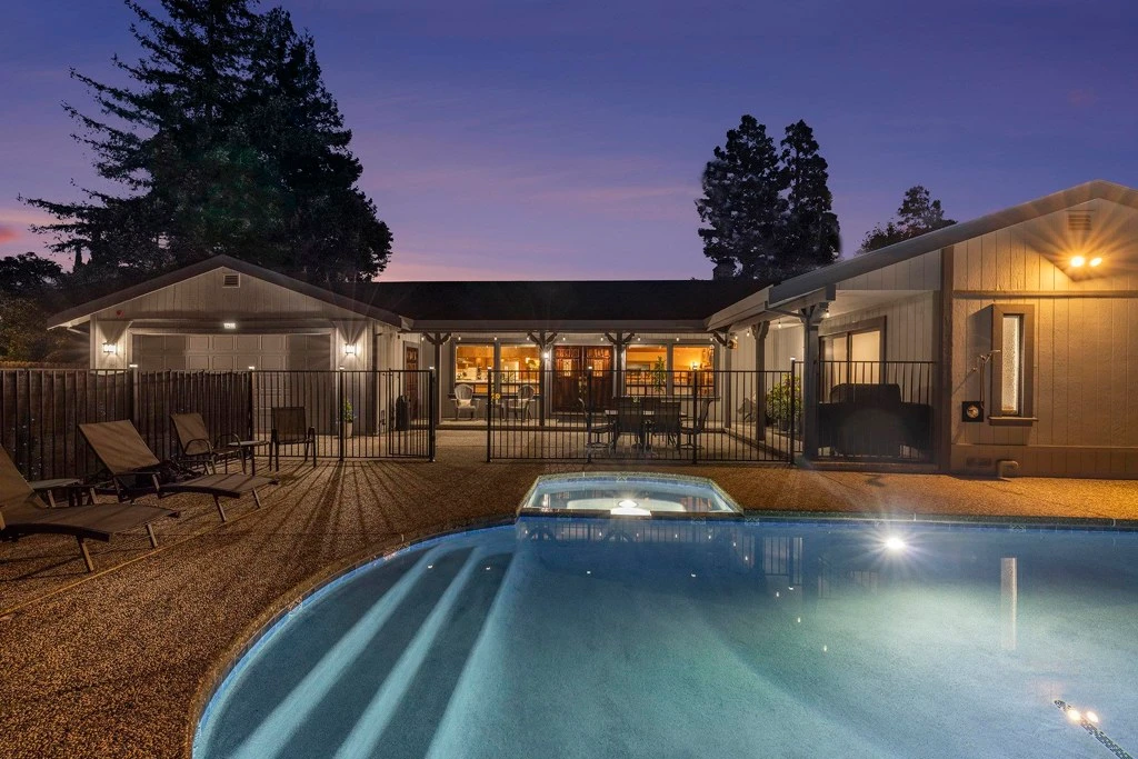 Tucked at the end of a private lane shared by six homes in Concord’s Mt. Diablo School District, this custom single-story 3BD/3BA offers 2,705 sq. ft. on an 11,250 sq. ft. lot. A recently refinished PebbleTec pool and spa enhances indoor-outdoor living. Vaulted tongue-and-groove wood ceilings and exposed beams highlight the great room with a wet bar and sink, while a wood-burning fireplace insert anchors the open kitchen and formal living room. The formal dining room is a private space off the kitchen. The kitchen and pantry feature large islands ideal for entertaining and stainless steel appliances, 60" hood, 36" cooktop with 15" grill, and rare countertop blender hookup. This split-wing layout offers privacy with a primary suite, junior suite with private entry (used as office), and third bedroom with nearby full bath. The backyard is an open canvas for lawn or garden. Updates include fresh paint, black-framed windows, tuned-up roof, Carrier 5-ton HVAC, 50-gallon water heater, new fencing, safety pool gate, and 15' x 126' driveway access.