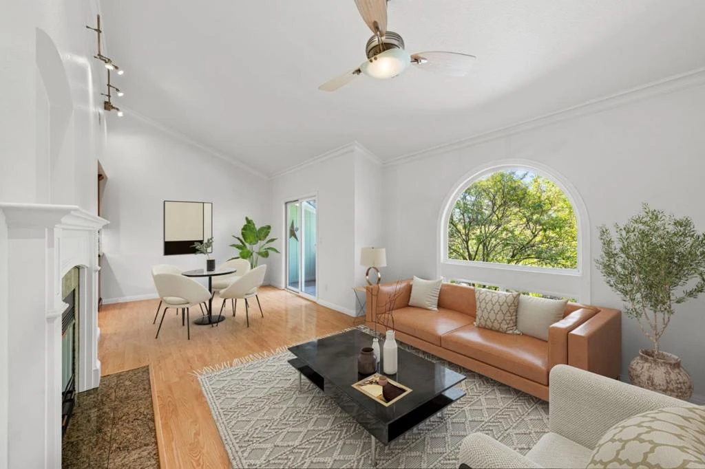 Beautiful 2-bedroom, 2.5-bath townhome nestled in the peaceful, tree-lined Montego Village community. This light and bright home features vaulted ceilings, laminate floors, recessed lighting, and dual-pane windows throughout. The chef's kitchen offers shaker-style cabinets, granite countertops, a decorative backsplash, pot filler, gas range, built-in microwave, and deep stainless sink. The primary suite includes a designer bath with a custom stall shower and vanity, plus a private outdoor deck. Enjoy additional outdoor living with a balcony off the dining area and fresh interior paint. With 1,108 sq. ft. of living space on a 1,296 sq. ft. lot, this inviting home combines comfort, style, and convenience in a beautifully maintained community.