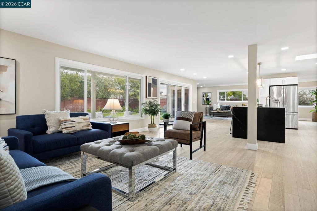 Completely updated & redesigned, this single-story home offers modern finishes, open living & a spacious backyard retreat in a well-established Concord neighborhood near shopping. A bright great room with wide-plank flooring, recessed lighting & oversized windows flows seamlessly into the dining area & remodeled kitchen, creating an expansive open-concept layout. The kitchen features a large island with dark stone counters & bar seating, white shaker cabinets, stainless steel appliances, farmhouse sink & abundant storage. Expansive bi-fold glass doors fully retract to the covered patio for true indoor-outdoor living. A separate family room showcases a dramatic floor-to-ceiling fireplace with sleek black slab surround. The primary suite offers backyard views, walk-in closet & an updated bath with dual vanities & tiled walk-in shower. Three additional bedrooms offer flexibility, with a remodeled hall bath featuring dual sinks, jetted tub & glass shower. A dedicated laundry room with storage & an adjacent full bath. The private backyard includes a covered patio, expansive lawn, mature landscaping with citrus trees & wide side yard. Close to shopping, 12 years of nearby schools including two established private high schools, BART & commuter routes.
