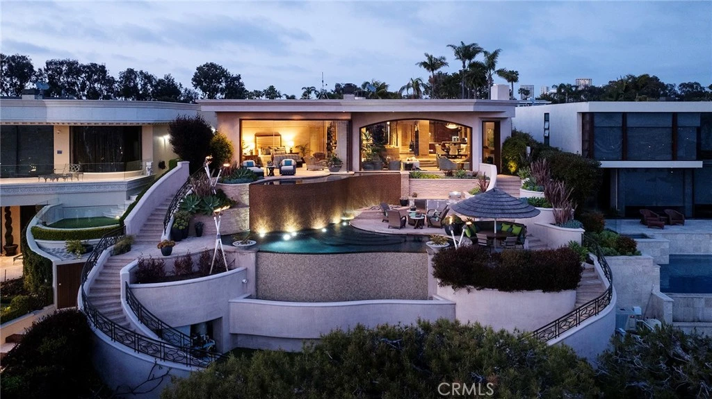 Sited on the premier street in Irvine Terrace, one of Corona Del Mar's most coveted neighborhoods, 1131 Dolphin Terrace distinguishes itself as a showcase property. Visitors are welcomed into the courtyard by meticulously curated landscaping from Roger’s Gardens, guiding them to the custom Honudran mahogany-wrapped double doors that lead to the formal entry. The focal point of the main living area is a floating fireplace extending through an octagonal skylight in the ceiling, flanked by two substantial saltwater fish tanks totaling over 1,100 gallons. A grand picture window spans the width of the living room, offering sweeping 180-degree views of Newport Harbor- considered to be some of the best in the region. Frameless glass doors adorned with hand-carved mahogany Dolphin handles (a nod to the iconic Dolphin Terrace) provide access to the backyard, featuring a custom-designed, zero-edge curved pool and spa, a 25-foot Italian glass wall, and an outdoor cooking area with a fire pit, and steps which lead down to a gated access point on Bayside Drive, allowing for easy access to the world-famous Balboa Island. A private sitting area rests adjacent to the primary bedroom which boasts walls of floor-to-ceiling glass, offering panoramic views out to the jetties of the harbor entrance and another of the three interior fireplaces. The primary bathroom showcases dual vanities, a walk-in shower, jacuzzi tub, heated tile floors, and an expansive walk-in closet. Venetian plaster walls guide you to two additional substantial ensuite bedrooms and a fully outfitted home theater. The dining room, adorned with suede padded walls, provides convenient access to the kitchen, appointed with high-end stainless steel appliances, two built-in sub-zero refrigerators, and custom mahogany cabinetry. An additional ensuite bedroom, currently utilized as an office, a laundry room, and an oversized 2-car garage equipped with a full sound system, round out the features. This impeccably maintained home, with no expense spared, is in pristine condition and has been meticulously cared for by the current owners.
